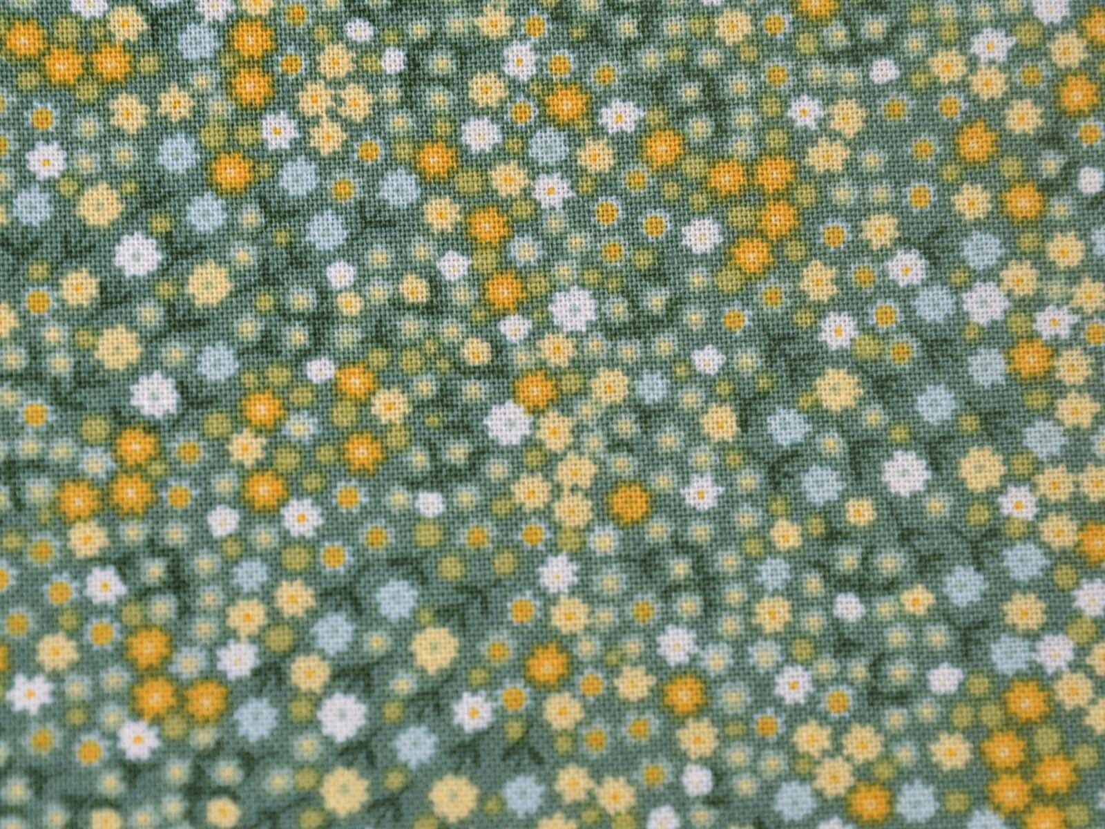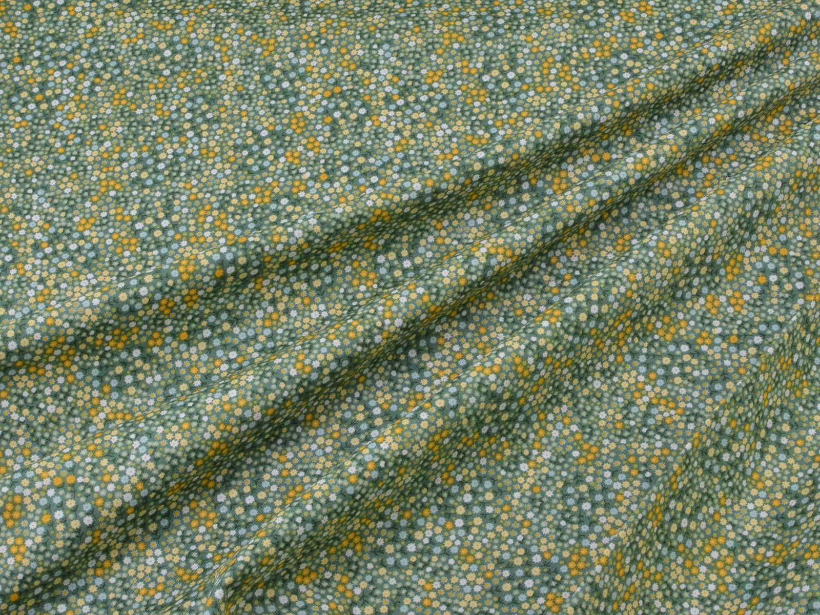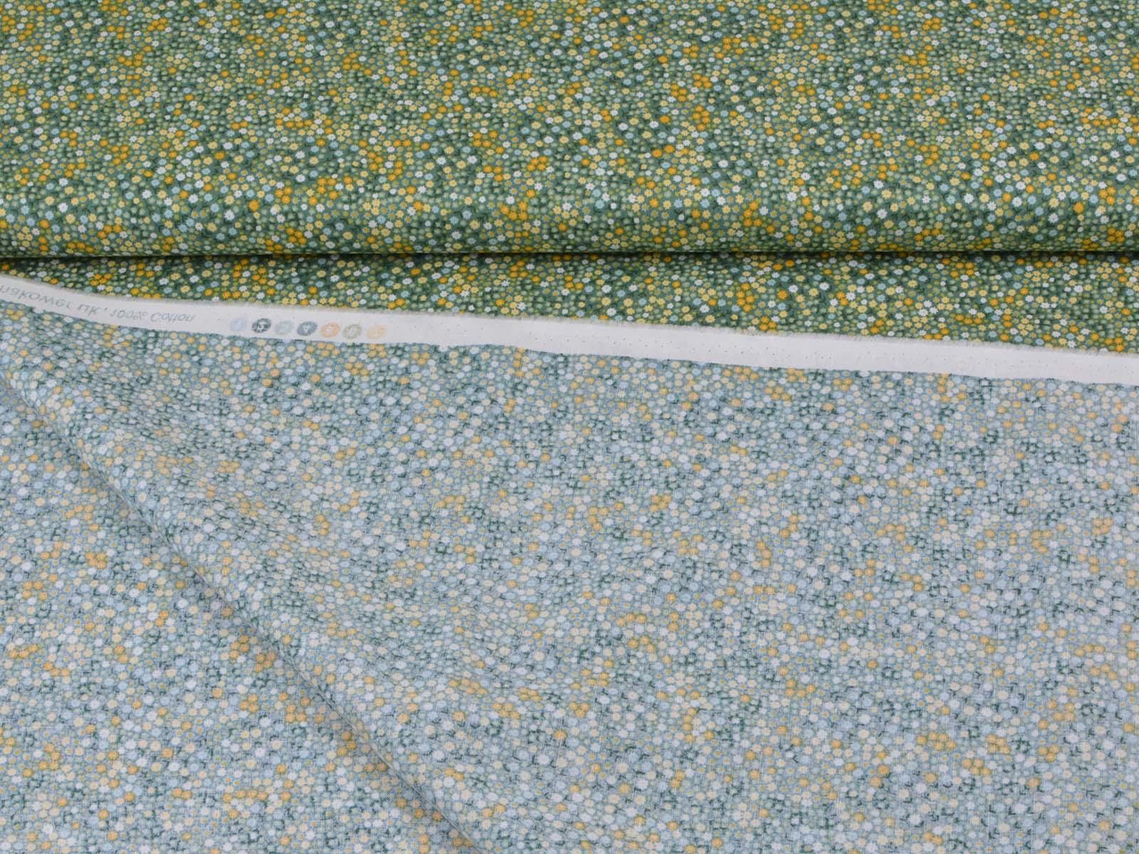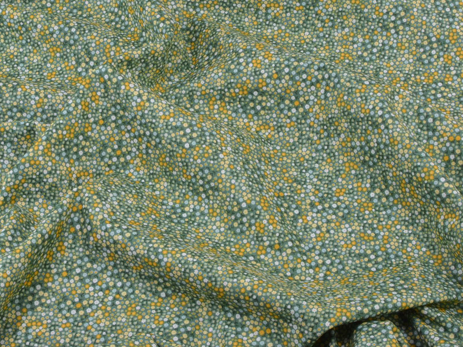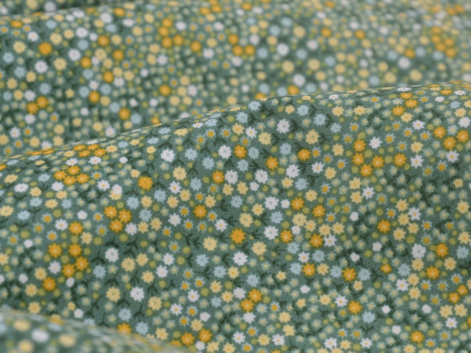 Woven cotton fabric from Makower UK. The fabric is green with small flowers. The cotton is smooth and thin. Sew cushions, bags, accessories, or use it for patchwork.