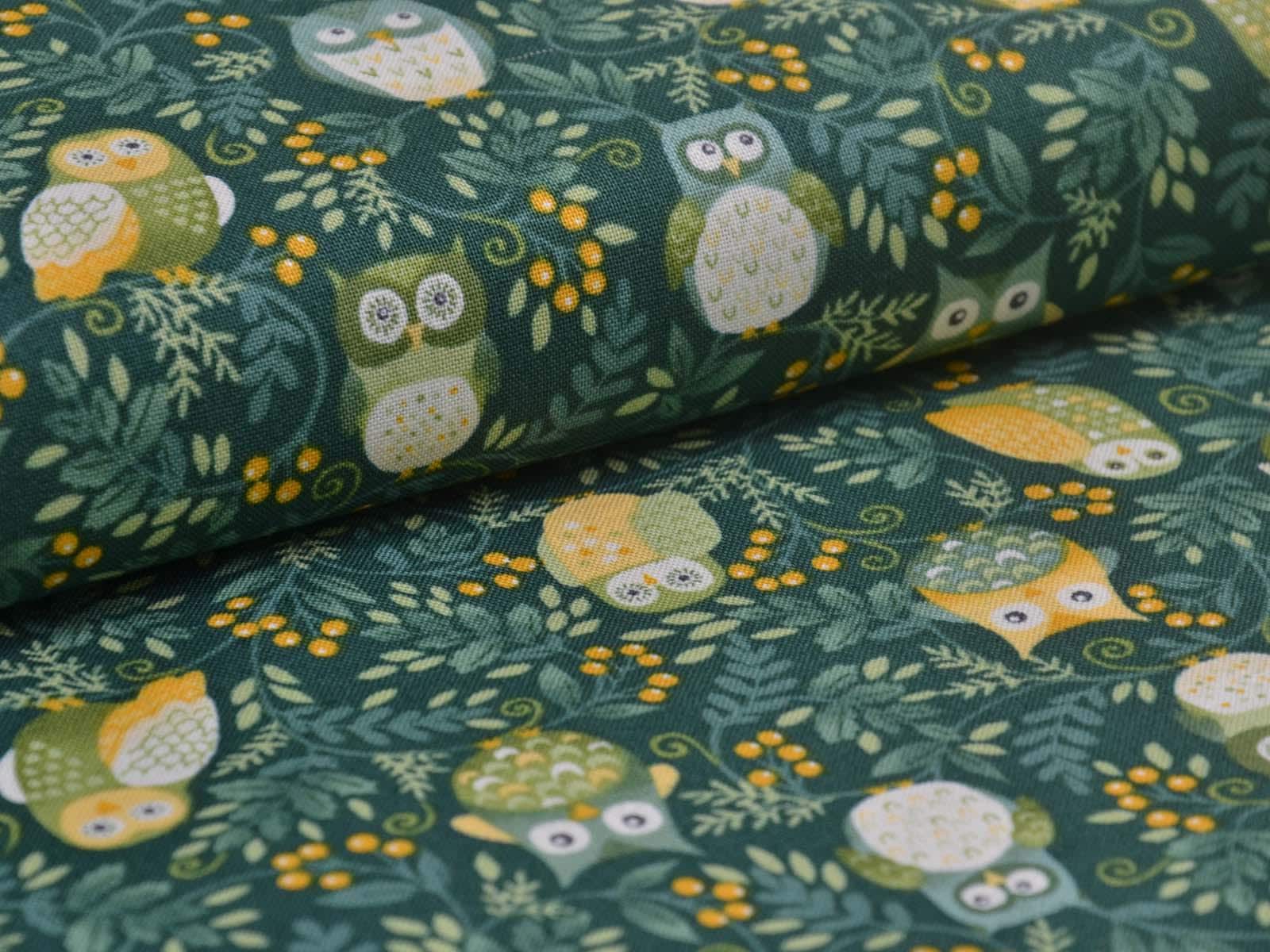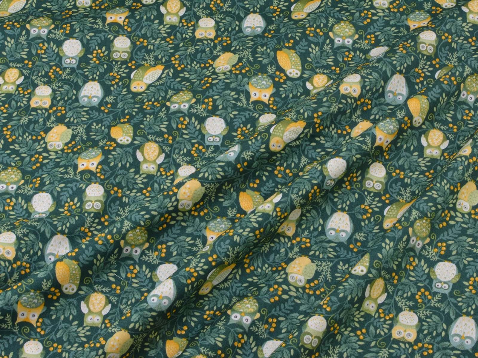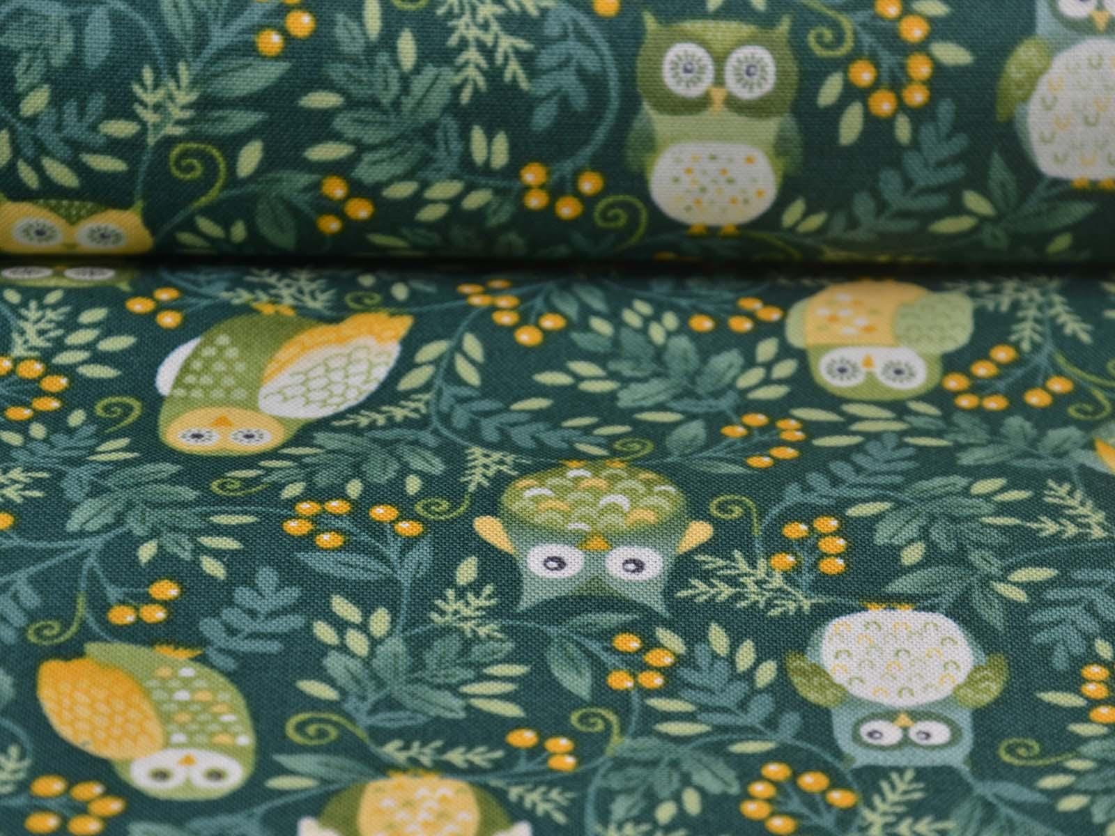 Woven cotton fabric from Makower UK. The fabric is petrol blue with owls and leaves. The cotton is smooth and thin. Sew cushions, bags, accessories, or use it for patchwork.