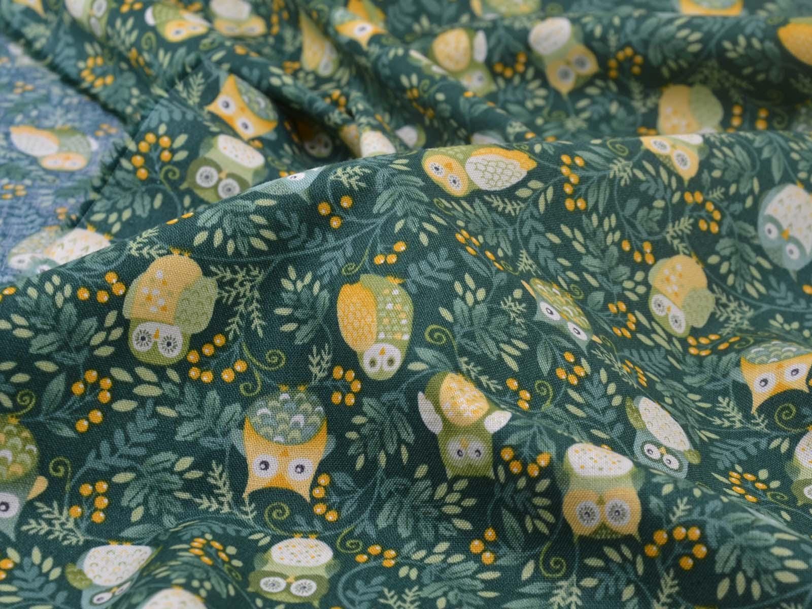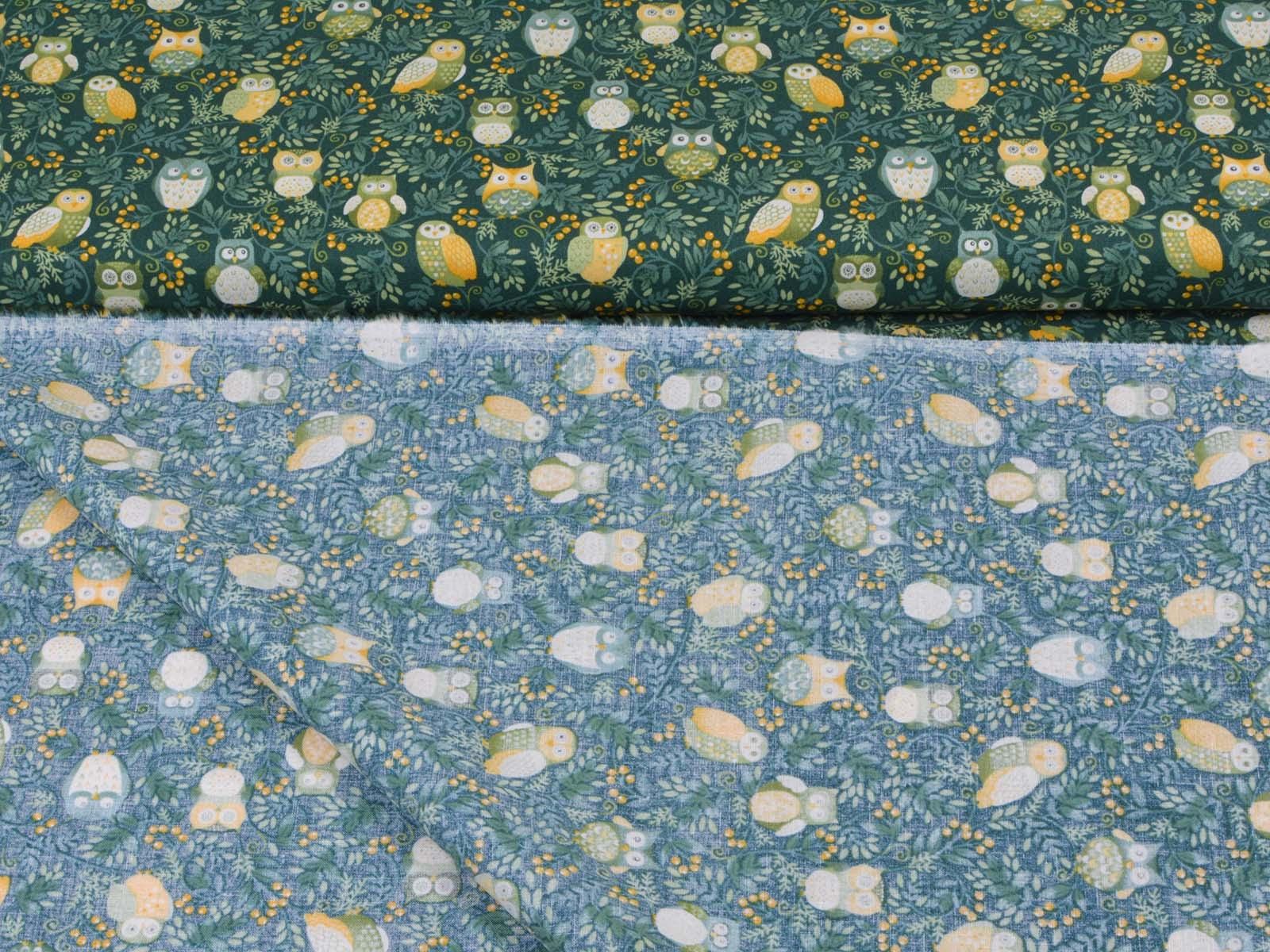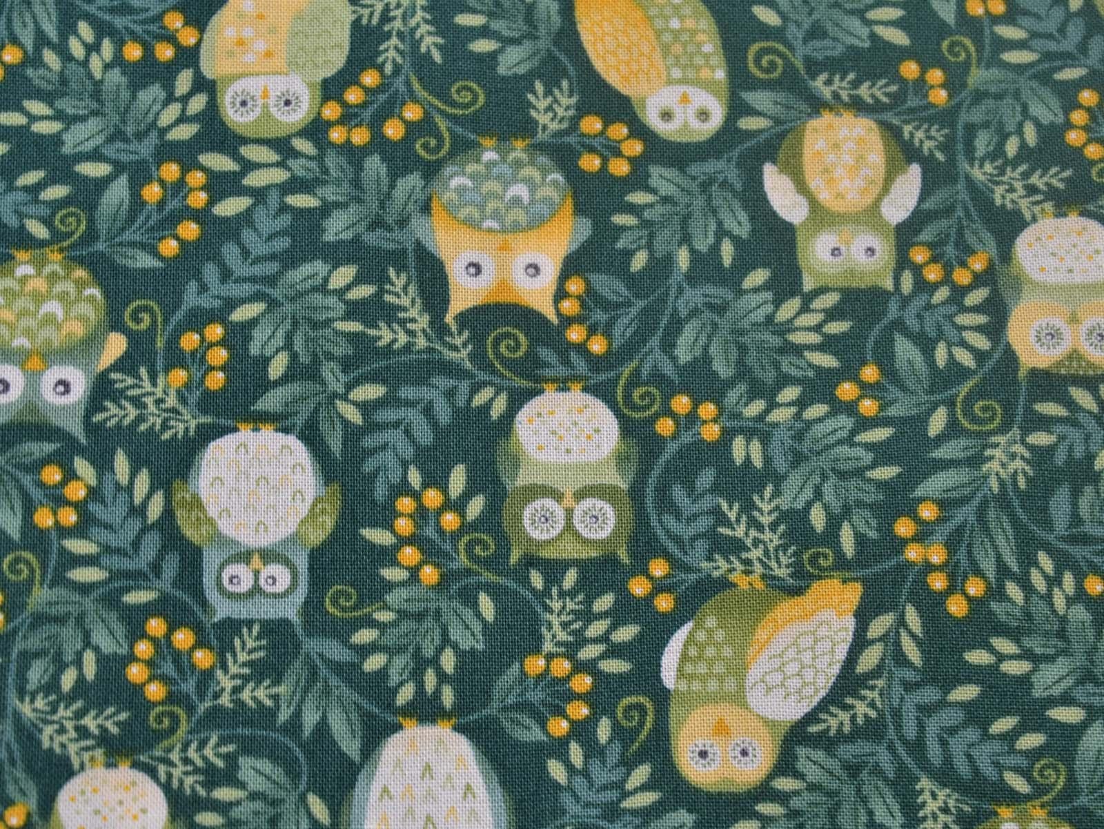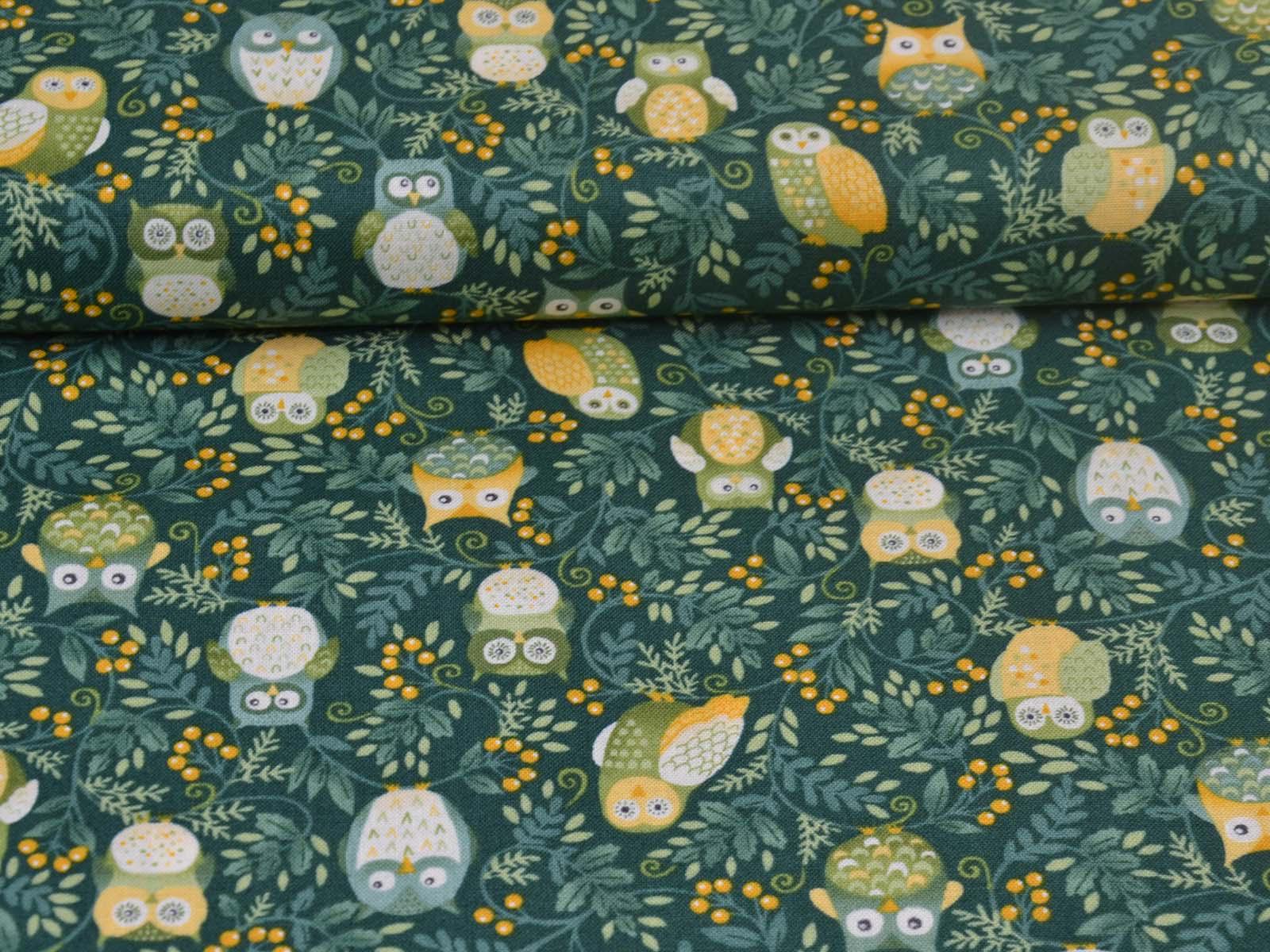 Woven cotton fabric from Makower UK. The fabric is petrol blue with owls and leaves. The cotton is smooth and thin. Sew cushions, bags, accessories, or use it for patchwork.