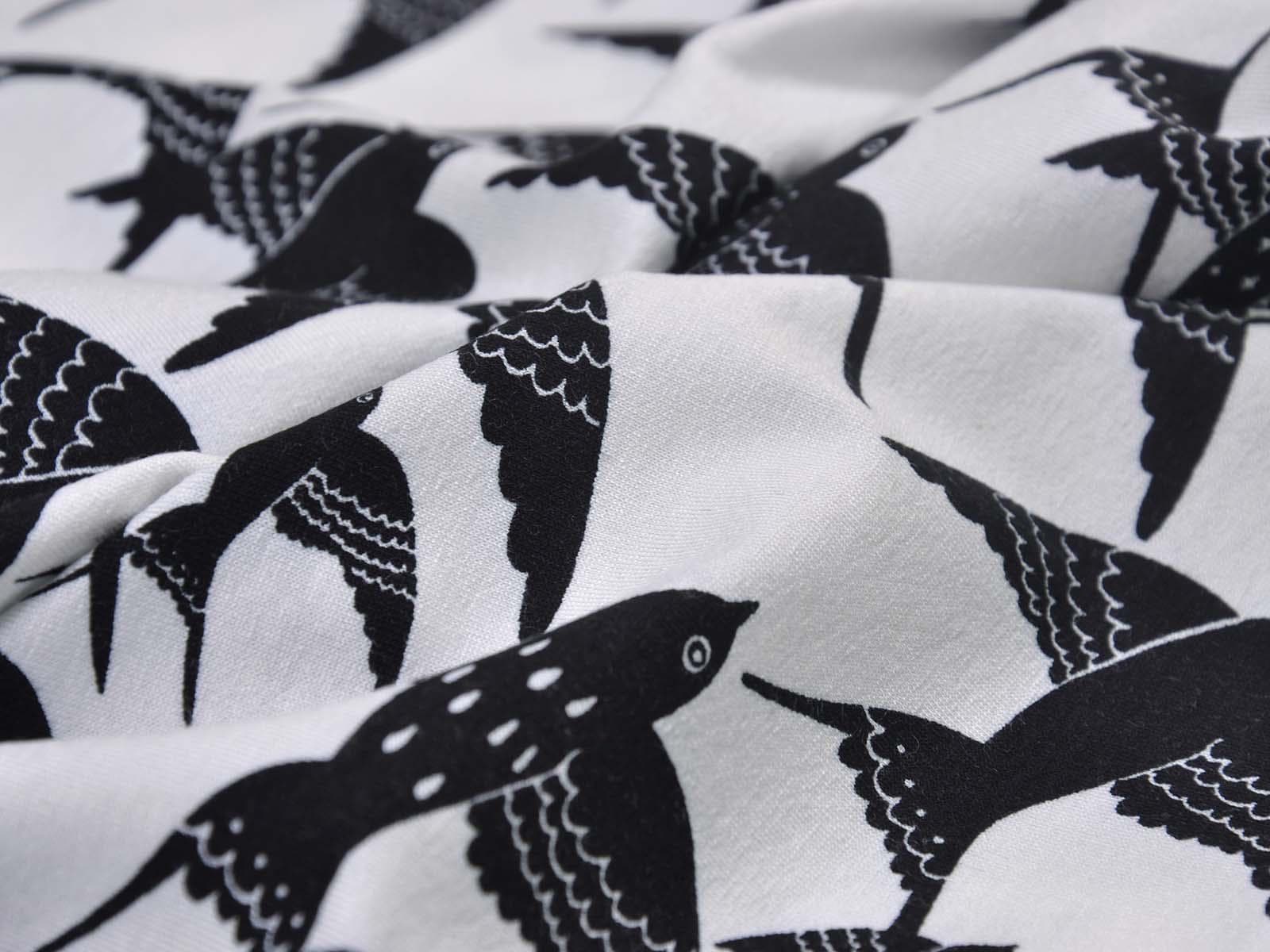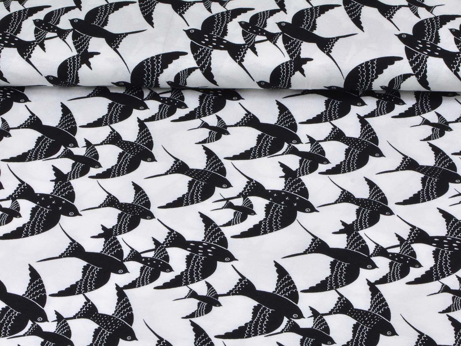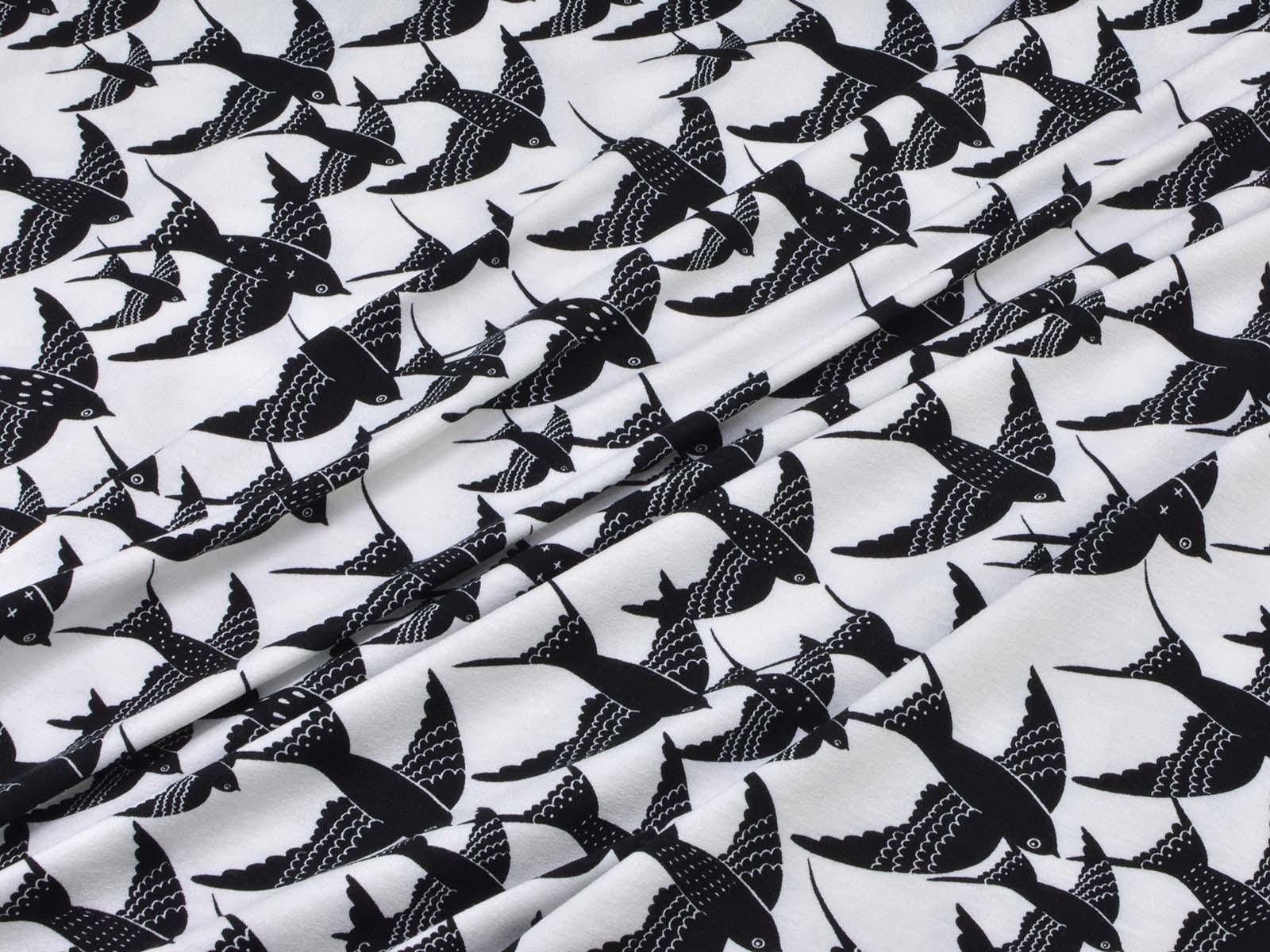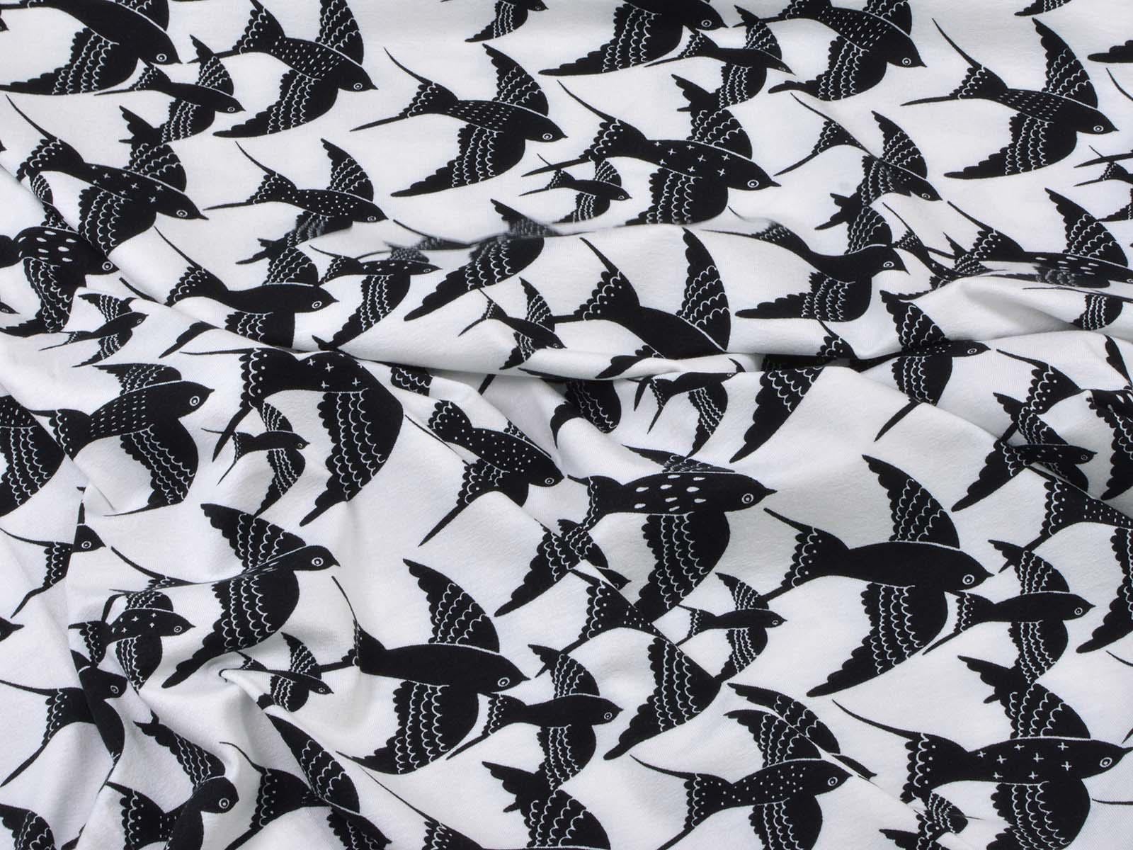 White viscose jersey with black birds. The fabric is thin, medium weight, and has a beautiful drape. It's suitable for sewing T-shirts, jumpsuits, skirts, and much more.