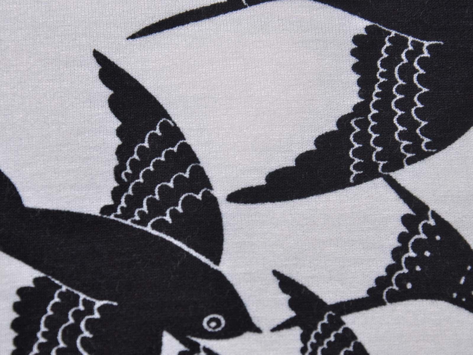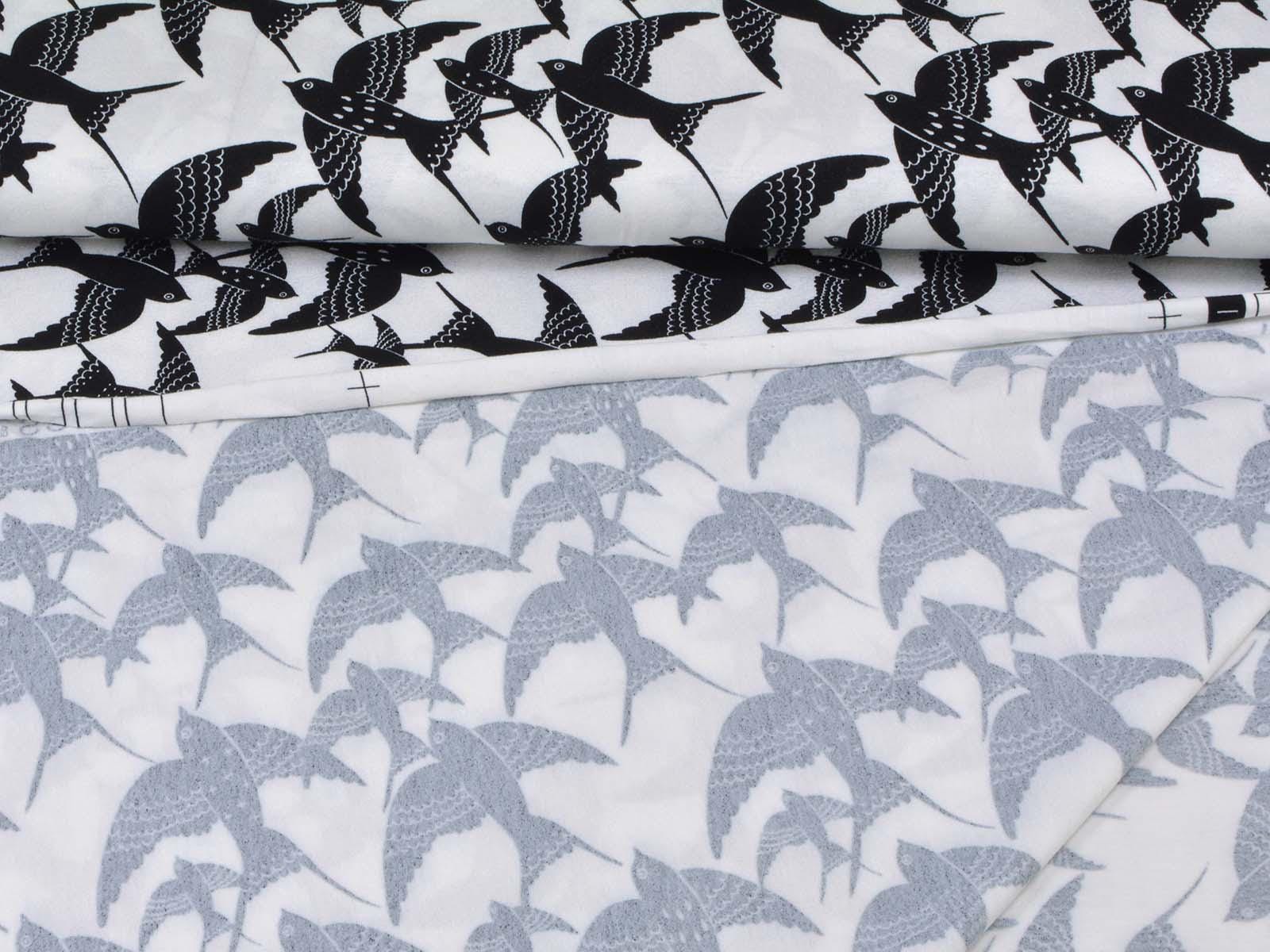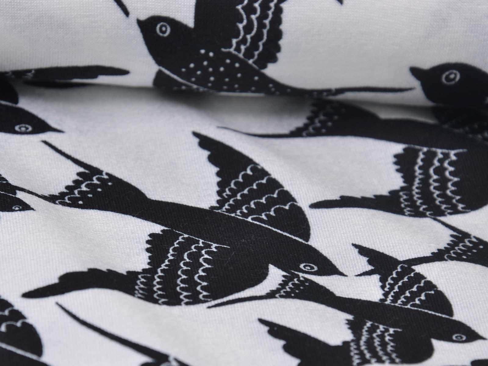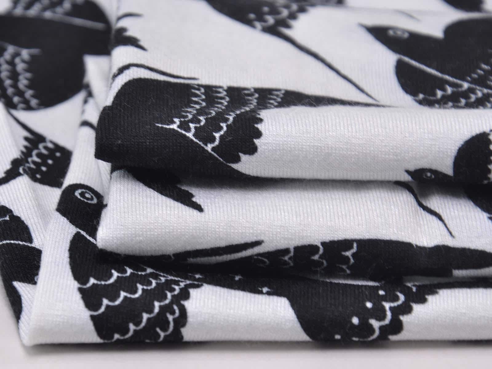 White viscose jersey with black birds. The fabric is thin, medium weight, and has a beautiful drape. It's suitable for sewing T-shirts, jumpsuits, skirts, and much more.