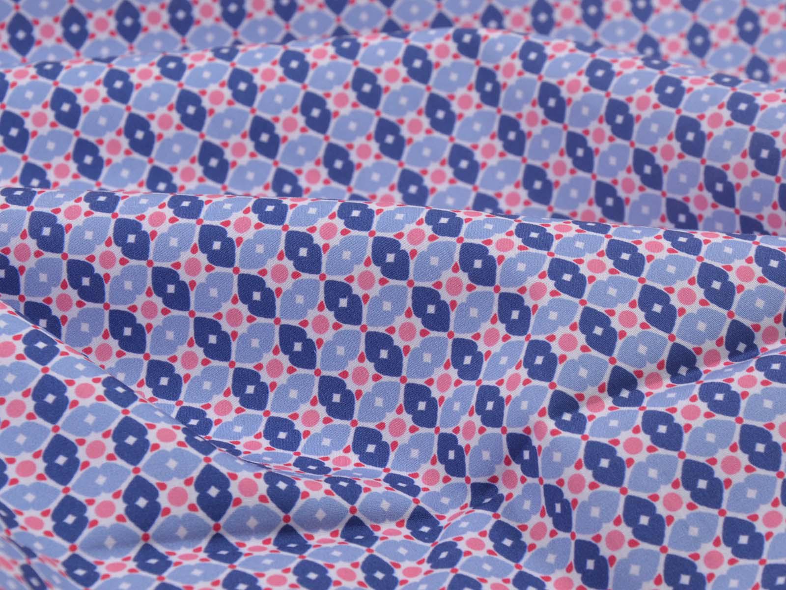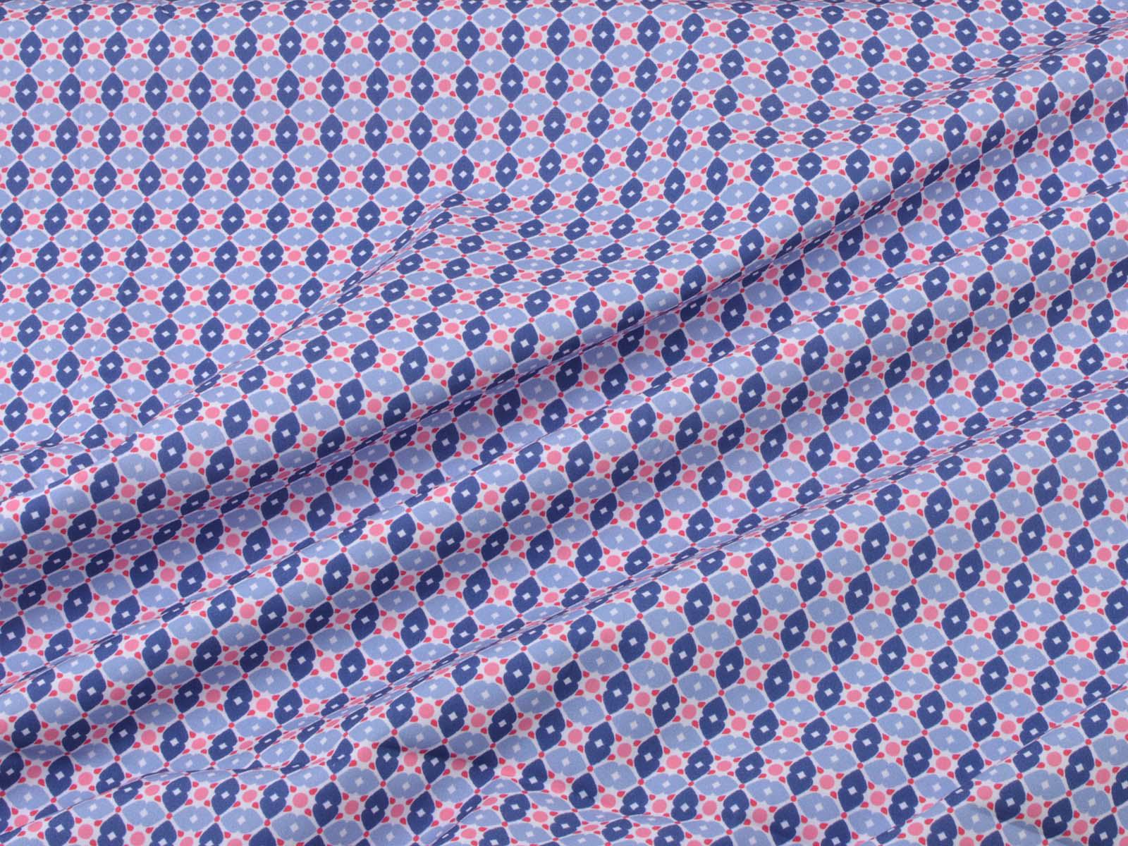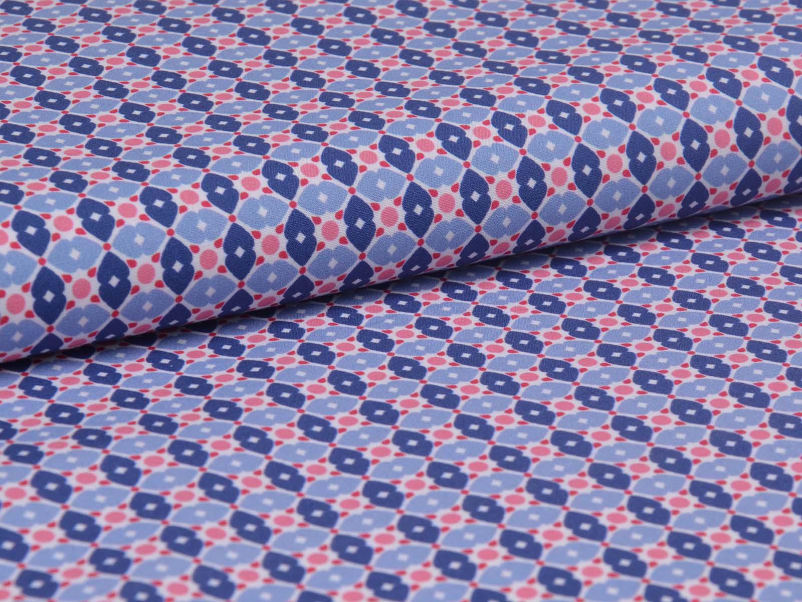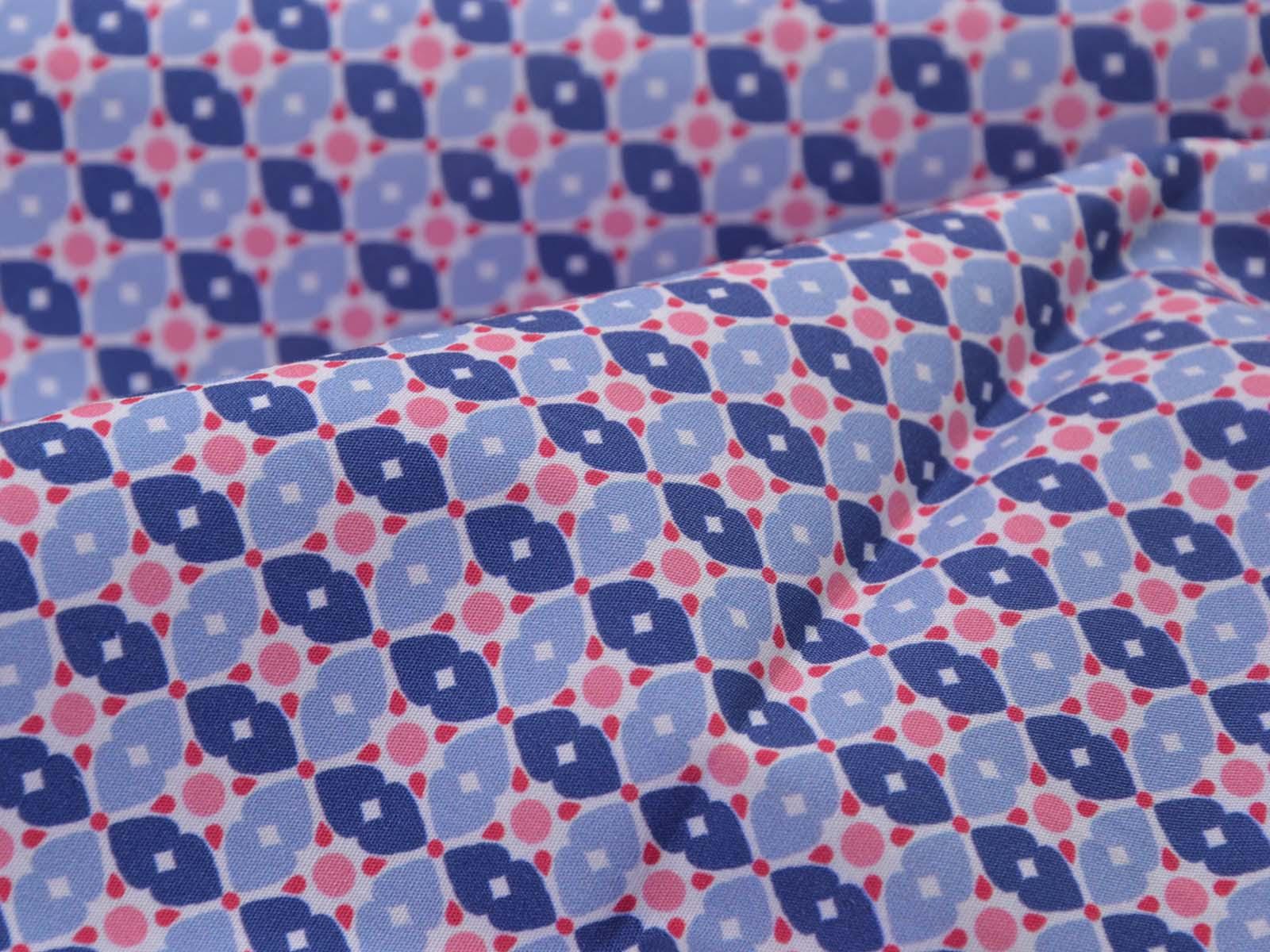 Cotton fabric from the Emilie series by Hilco. This smooth, lightweight poplin is white with blue flowers and pink polka dots. All fabrics in the Emilie 2025 collection can be beautifully combined. Sew shirts, dresses, cushions, bags, storage containers, or use the fabric for patchwork.