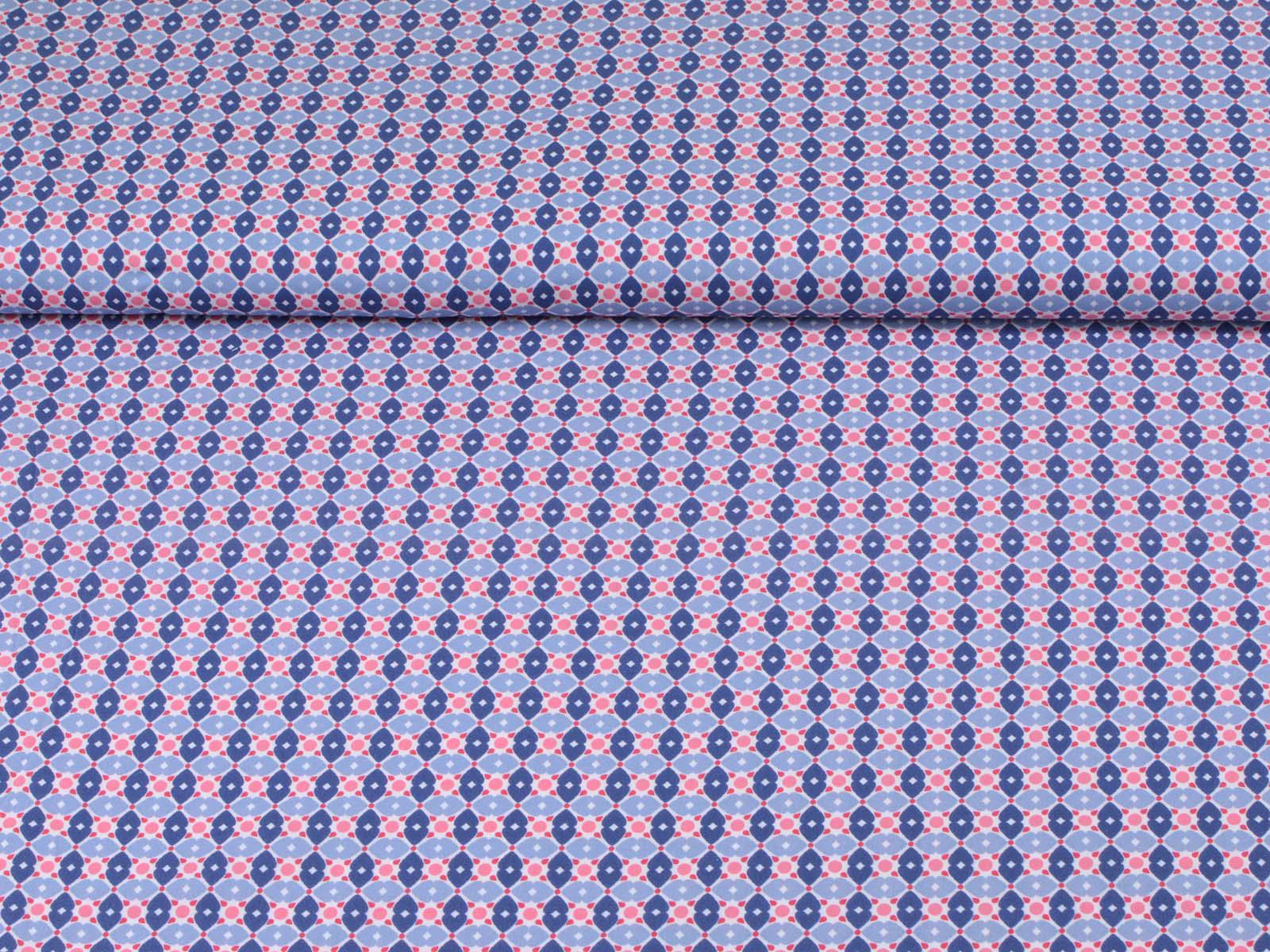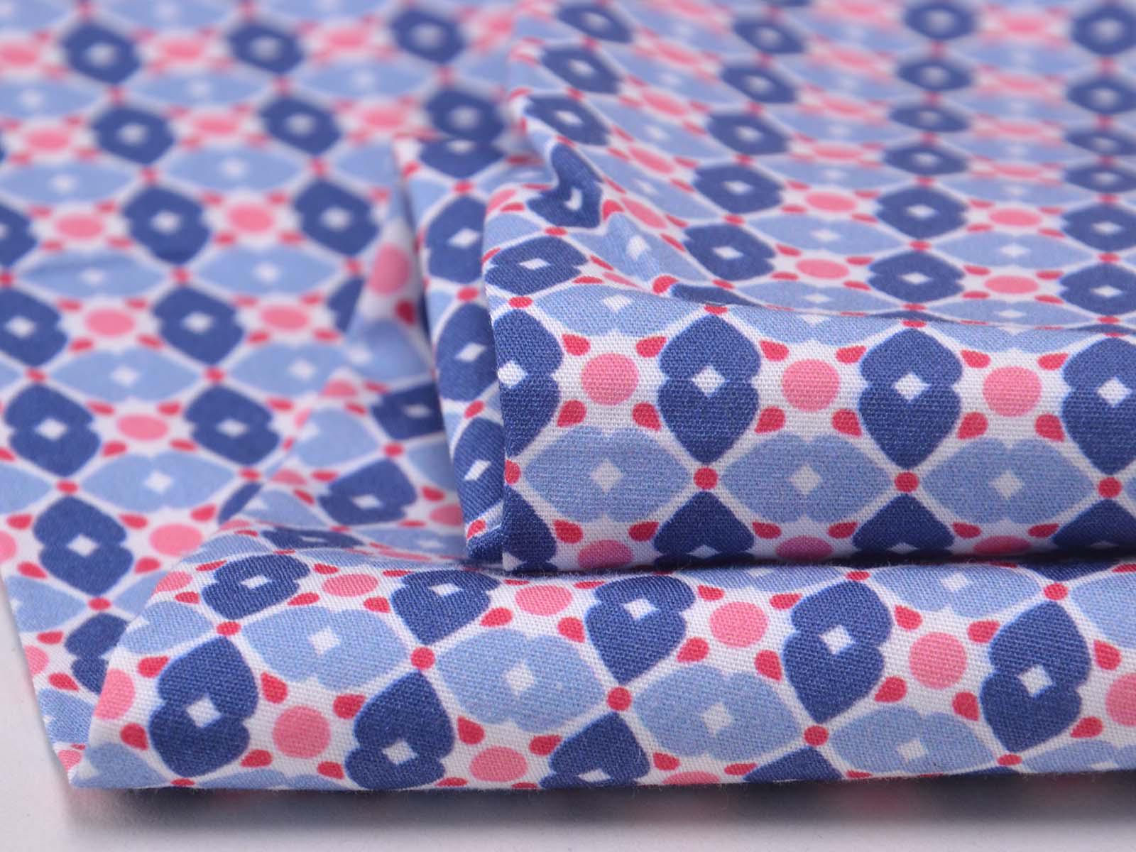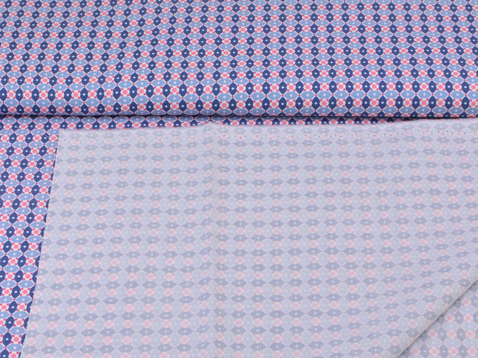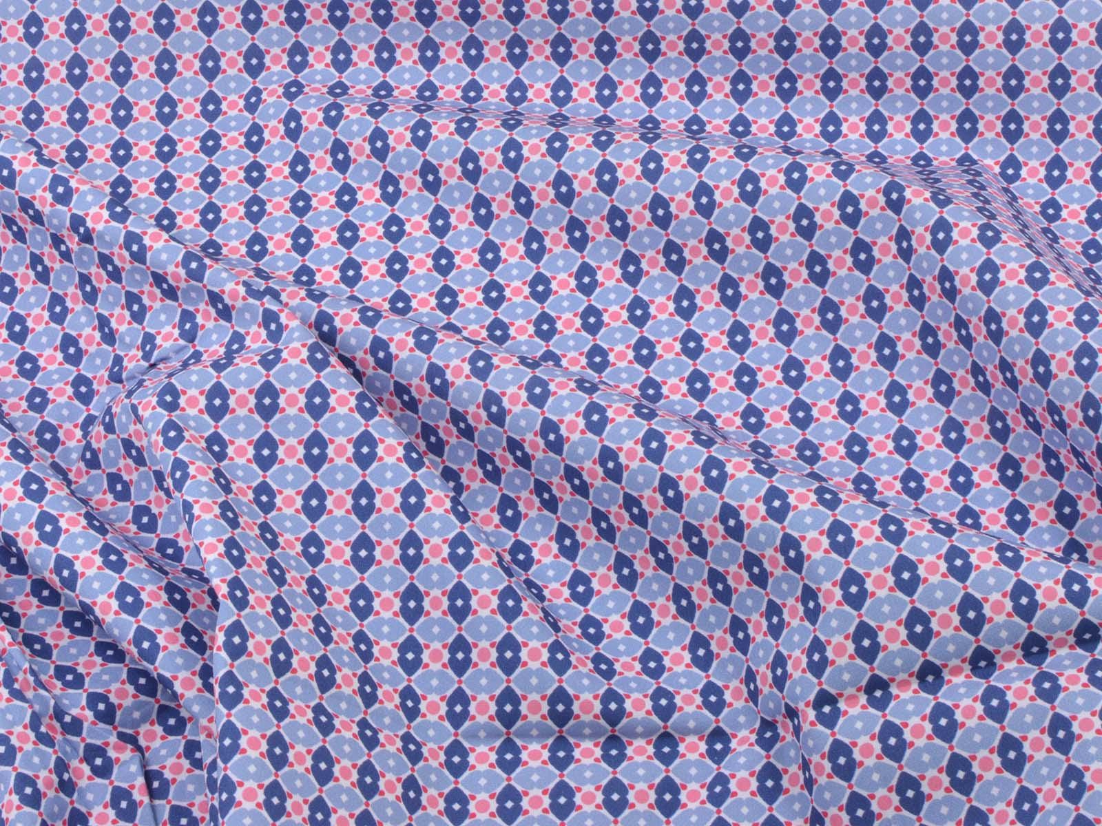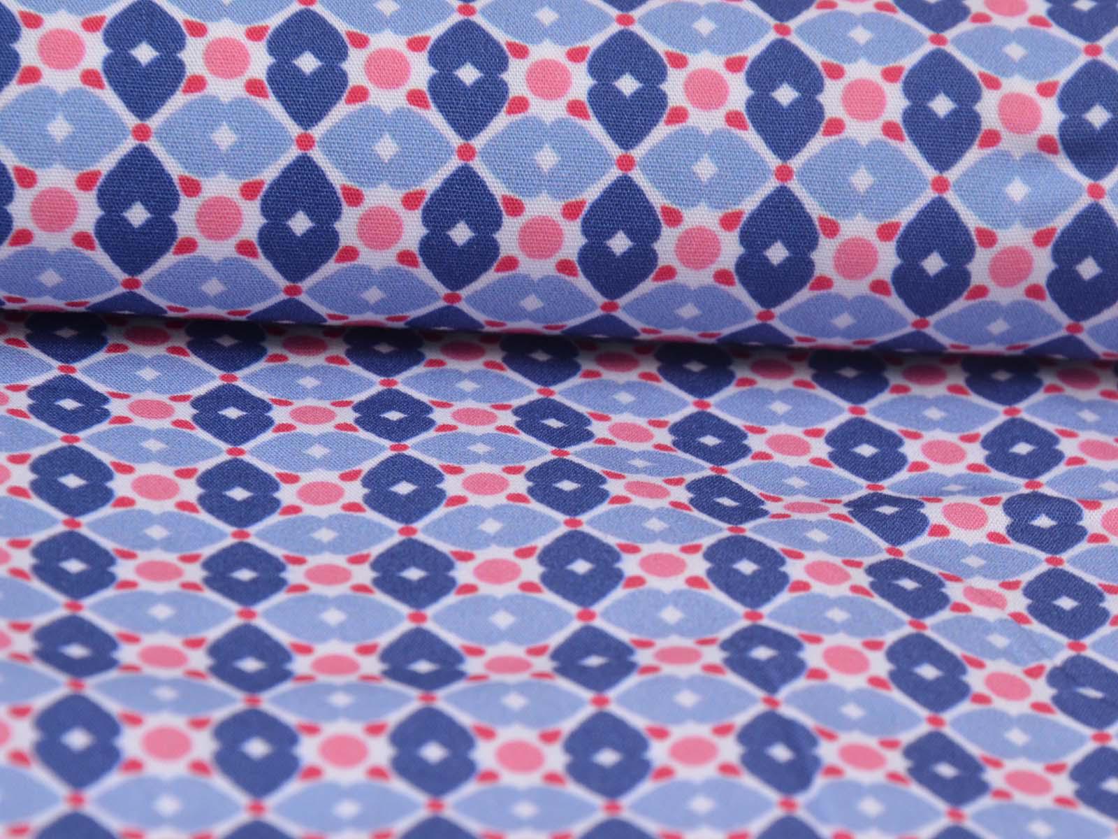 Cotton fabric from the Emilie series by Hilco. This smooth, lightweight poplin is white with blue flowers and pink polka dots. All fabrics in the Emilie 2025 collection can be beautifully combined. Sew shirts, dresses, cushions, bags, storage containers, or use the fabric for patchwork.