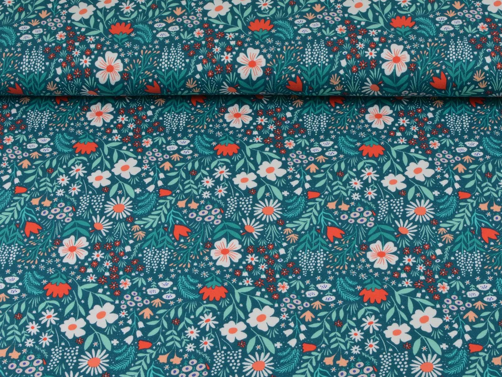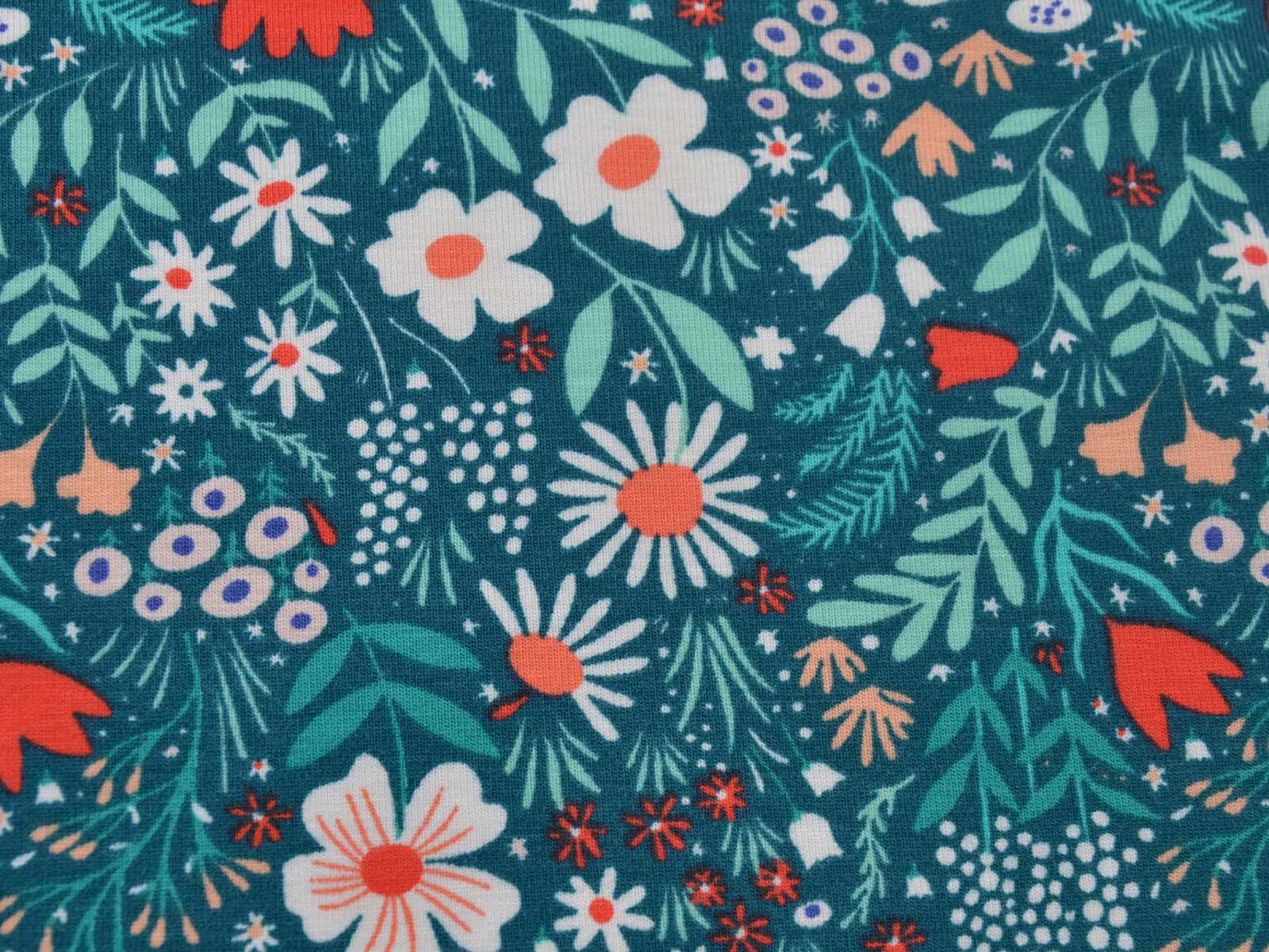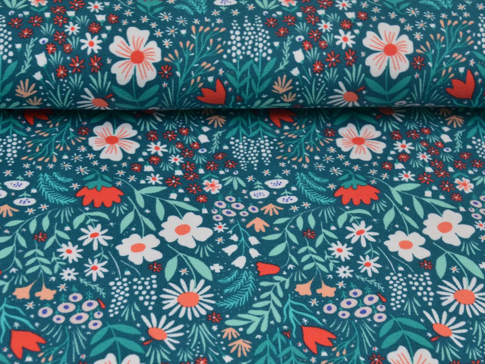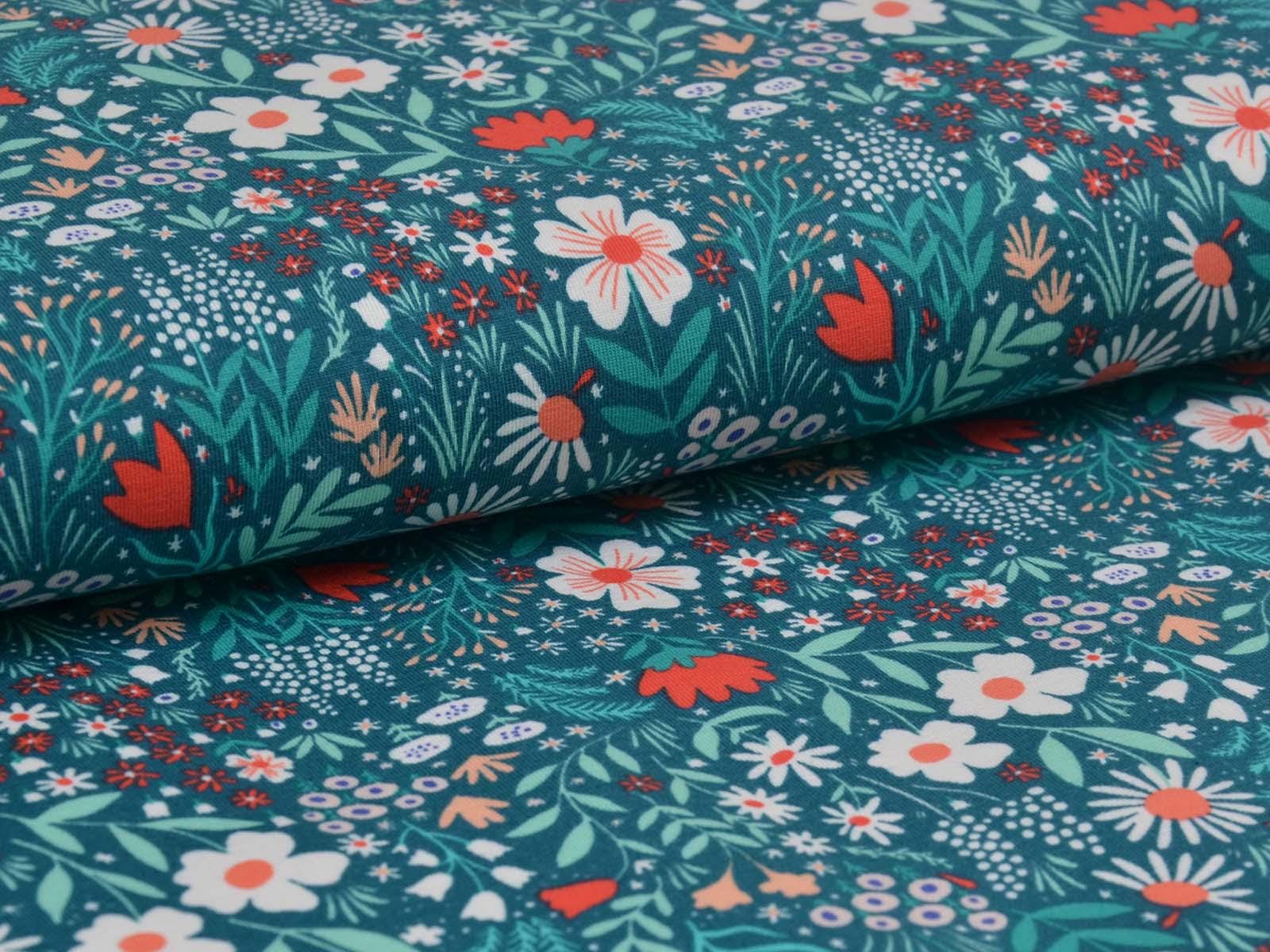 Cotton jersey with stretch. The fabric is petrol blue with red and white flowers. The jersey is smooth, matte, and patterned. Sew yourself harem pants, T-shirts, long-sleeved shirts, and much more.