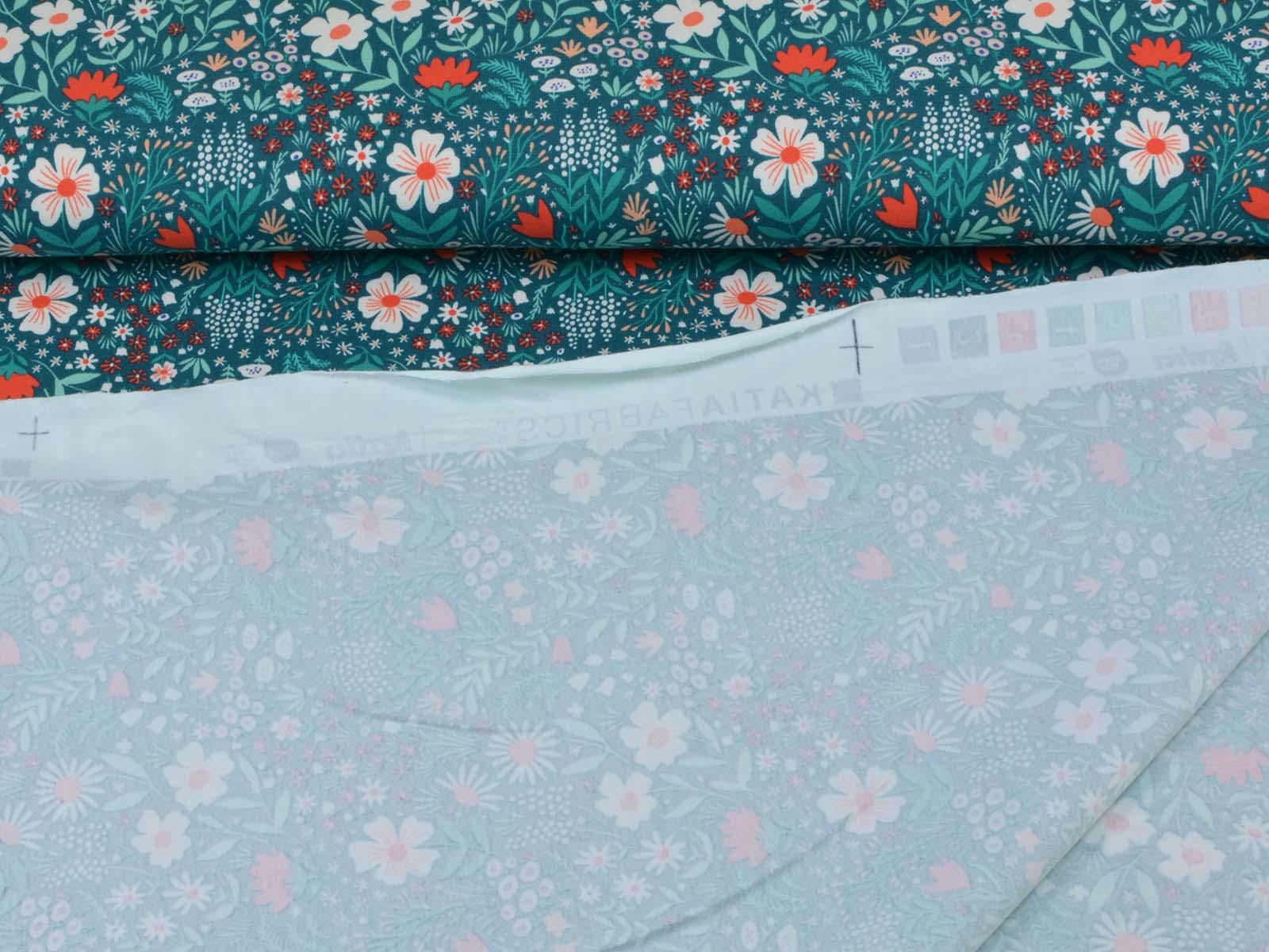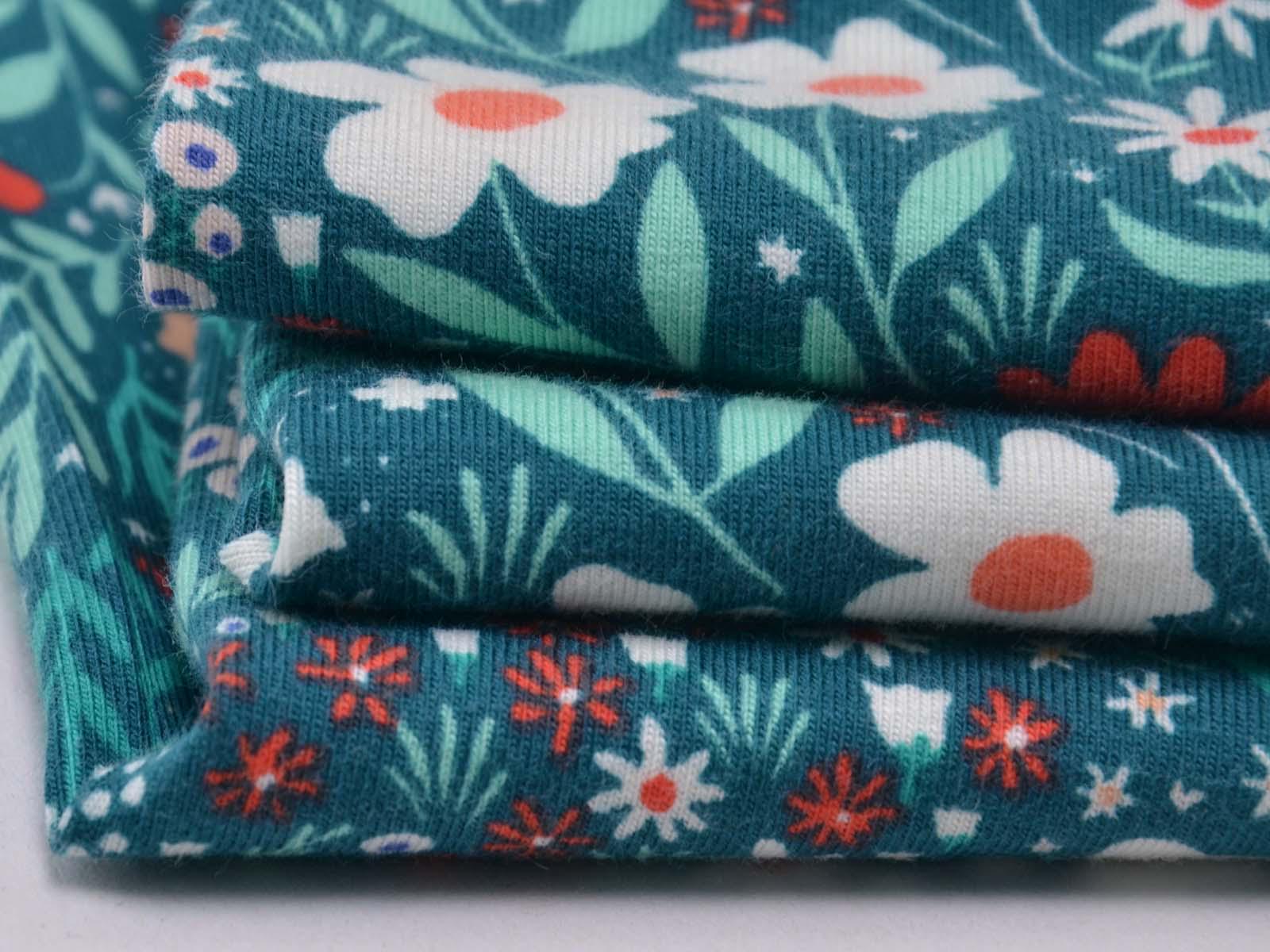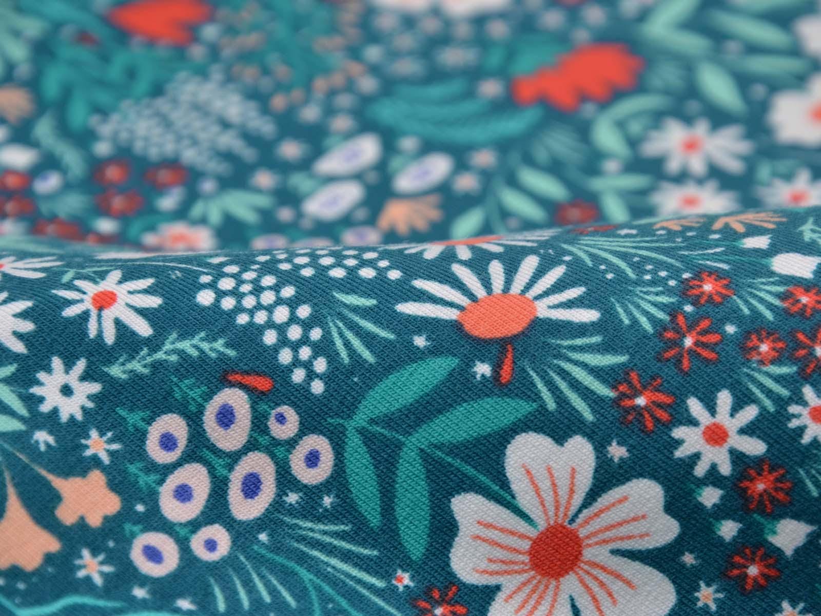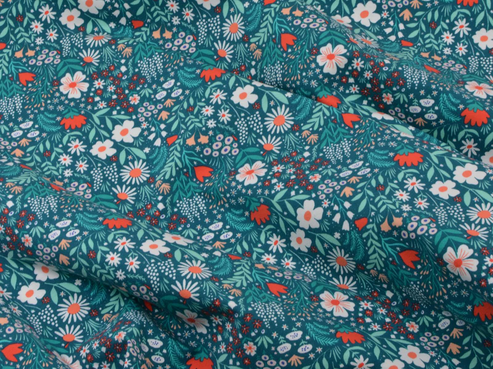 Cotton jersey with stretch. The fabric is petrol blue with red and white flowers. The jersey is smooth, matte, and patterned. Sew yourself harem pants, T-shirts, long-sleeved shirts, and much more.