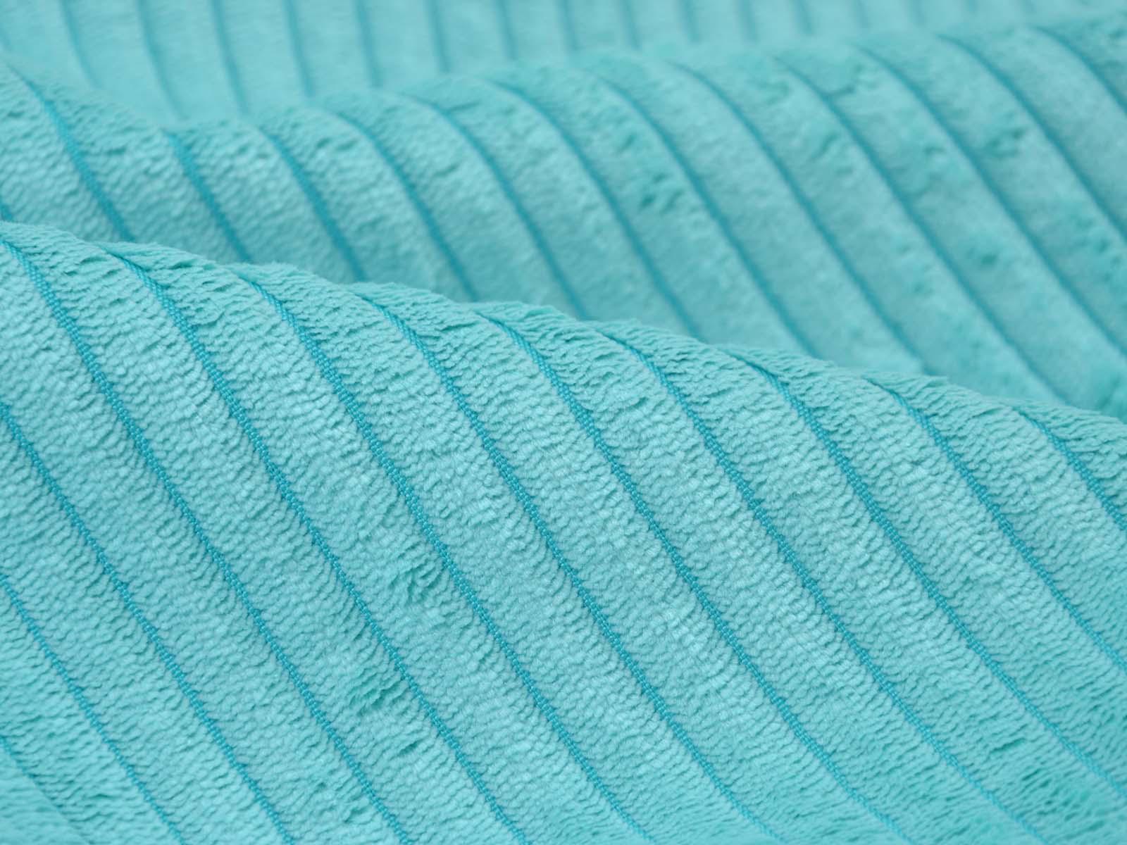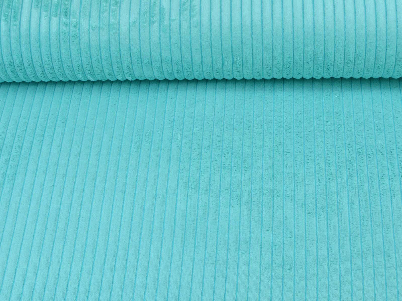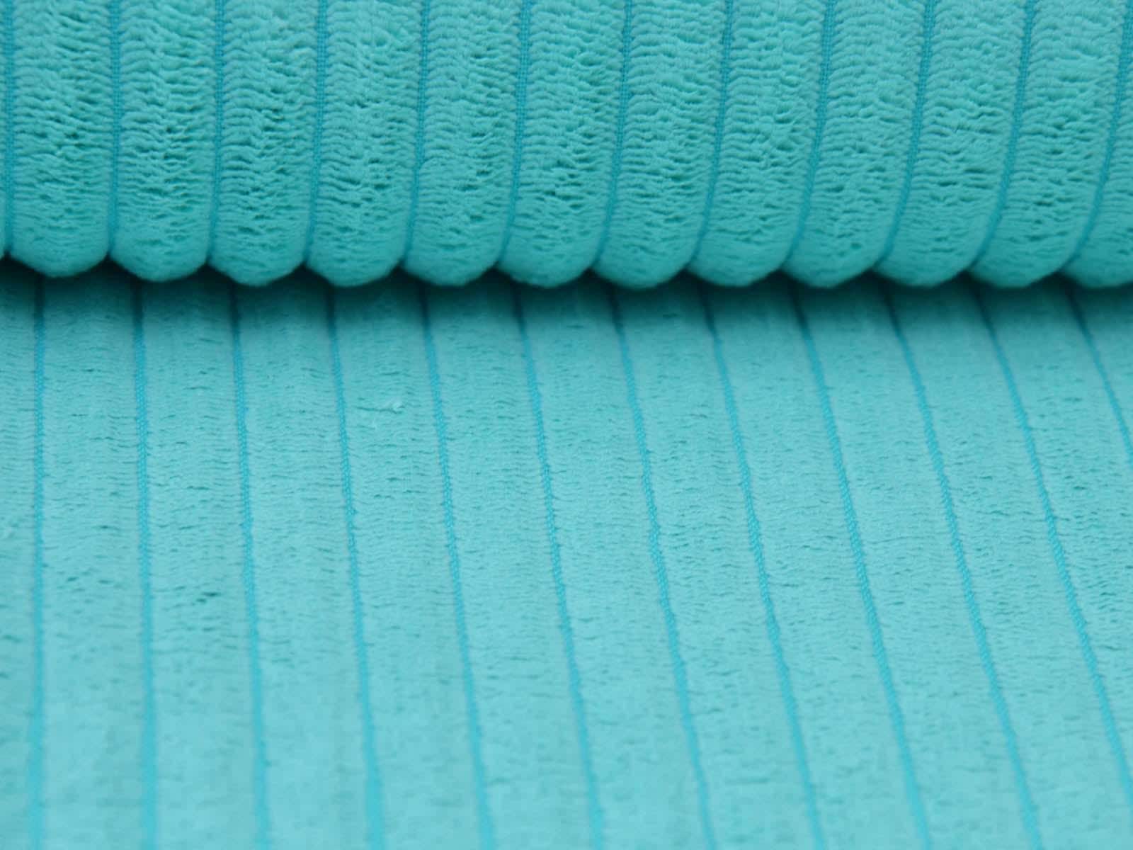 Wide corduroy fabric in turquoise. Each rib is approximately 1 cm wide. The cord has a velvety, soft feel. You can use it for upholstering armchairs, chairs, and sofas. Sew stylish fanny packs, tote bags, cushions, makeup bags, and much more from this wonderful fabric.