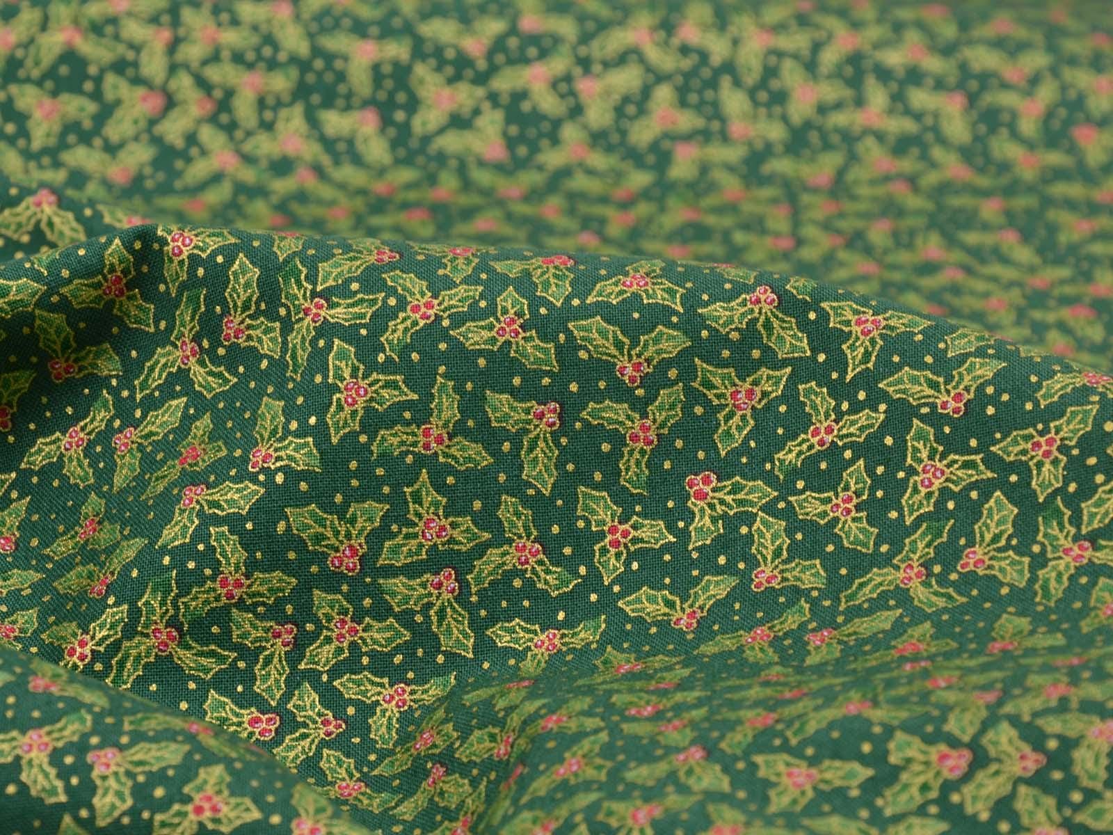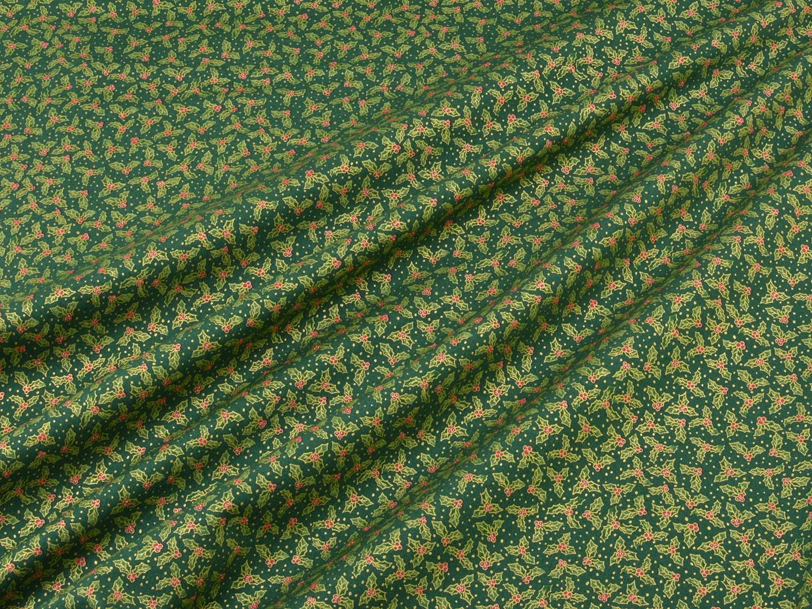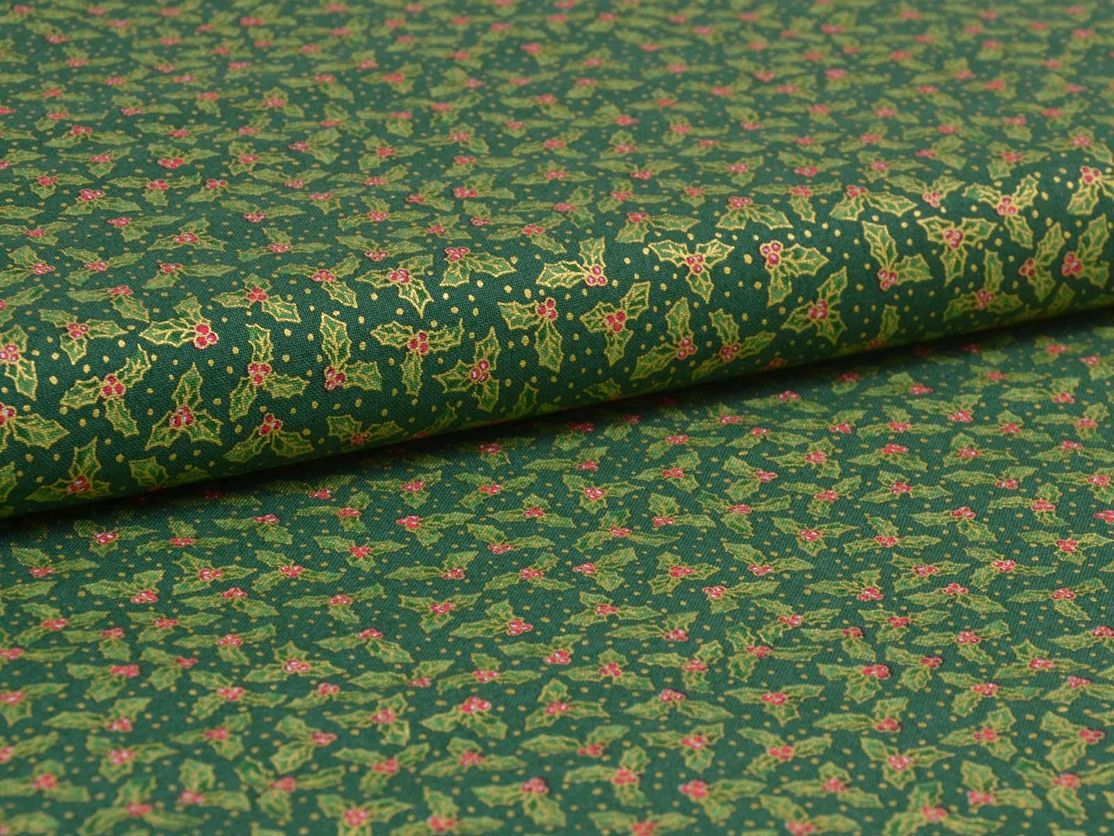 High-quality patchwork fabric made of cotton. The background is green, with green branches and red berries on it. You can use the fabric for patchwork projects, but also for sewing storage containers, placemats, tablecloths, and Christmas decorations.