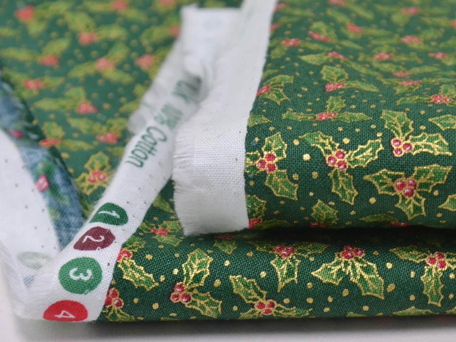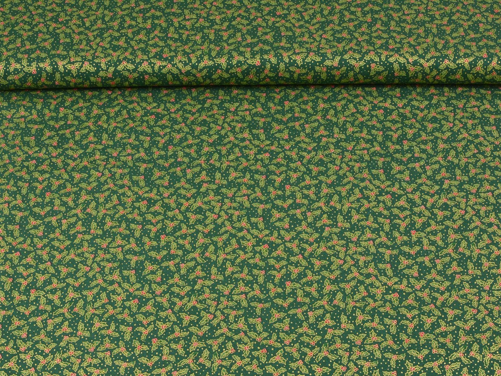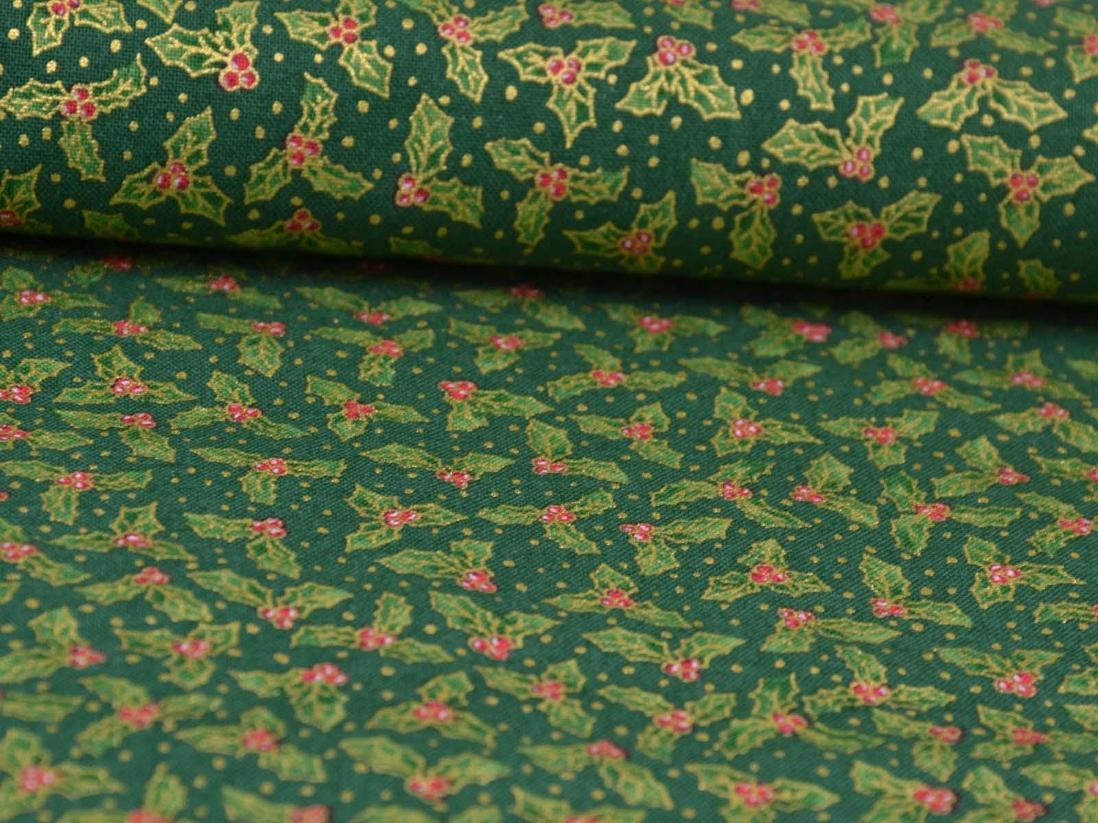 High-quality patchwork fabric made of cotton. The background is green, with green branches and red berries on it. You can use the fabric for patchwork projects, but also for sewing storage containers, placemats, tablecloths, and Christmas decorations.