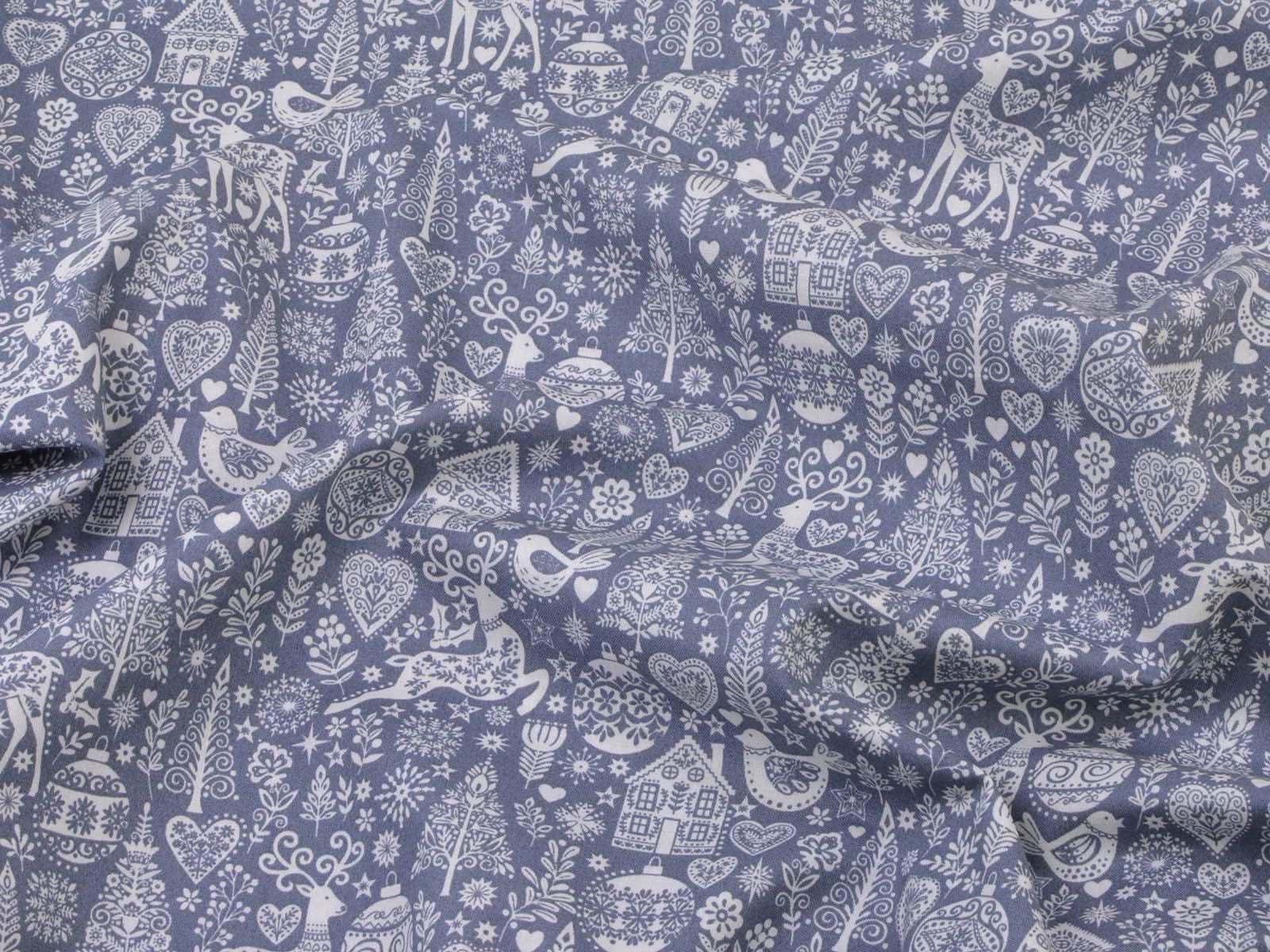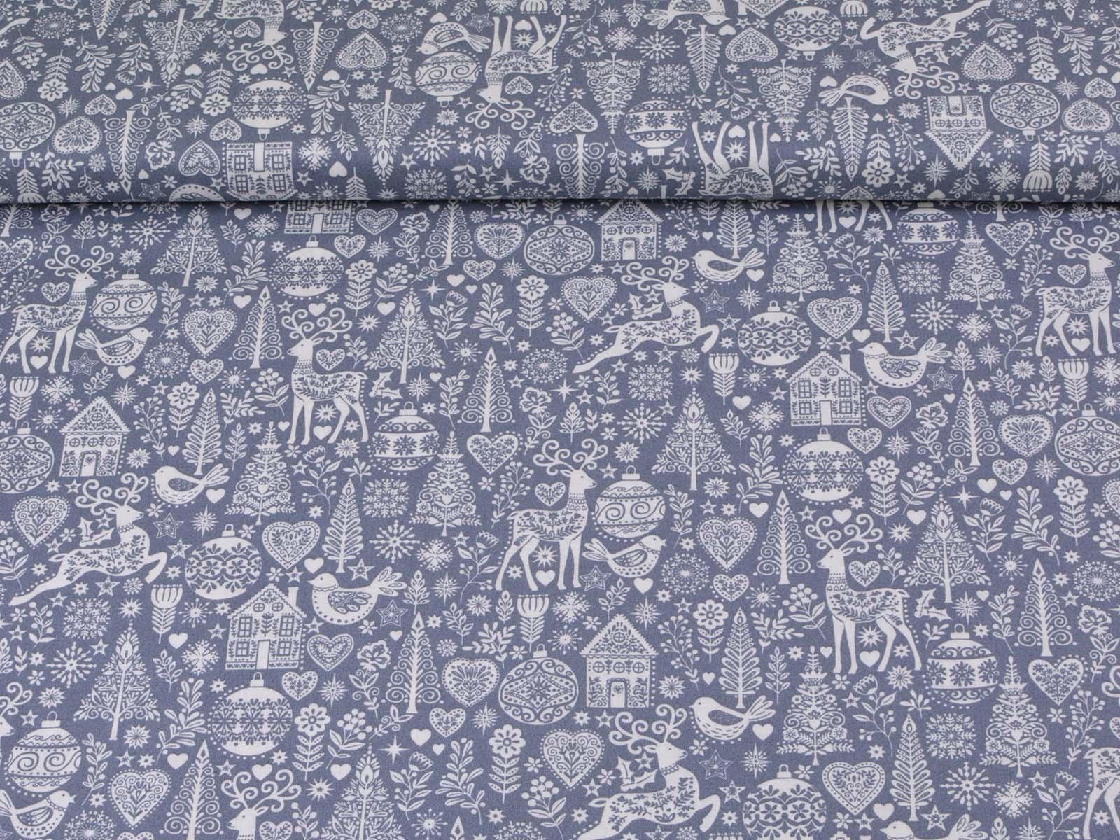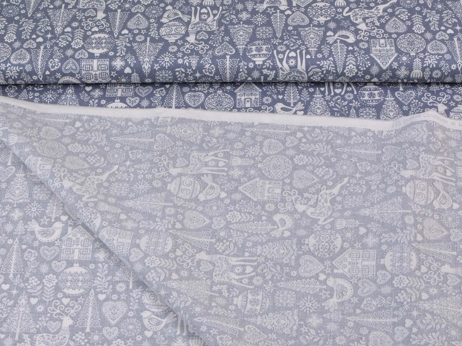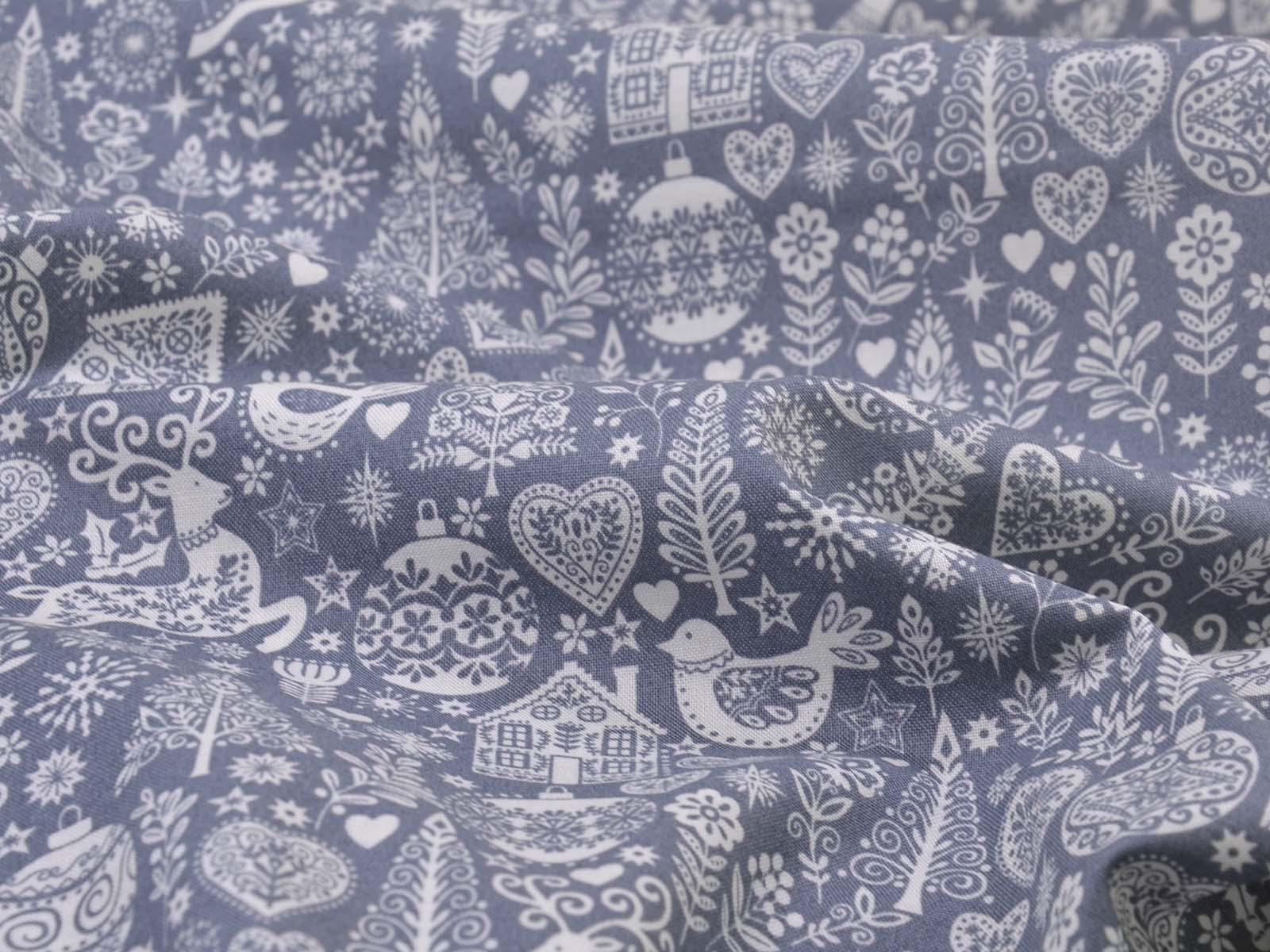 High-quality patchwork fabric made of cotton. The background is grey, with off-white deer, hearts, birds, houses, and baubles. You can use the fabric for patchwork projects, but also for sewing storage containers, placemats, tablecloths, and Christmas decorations.