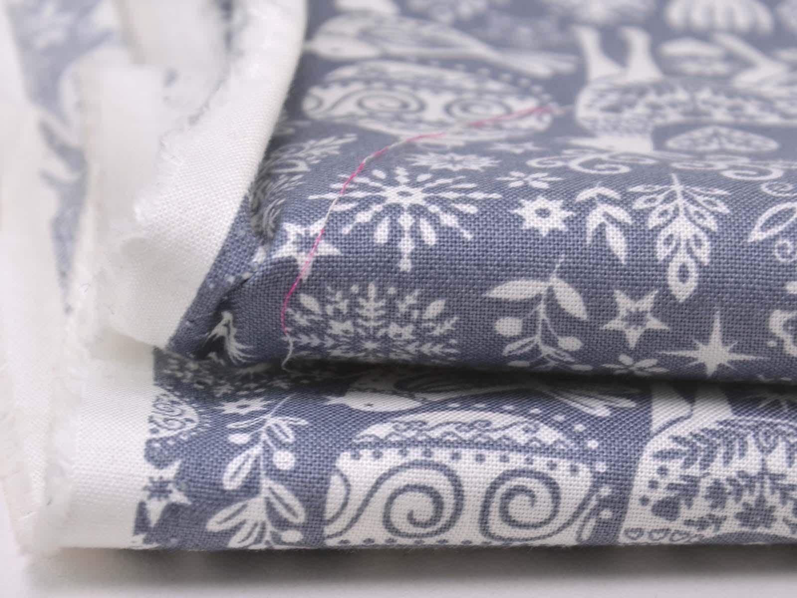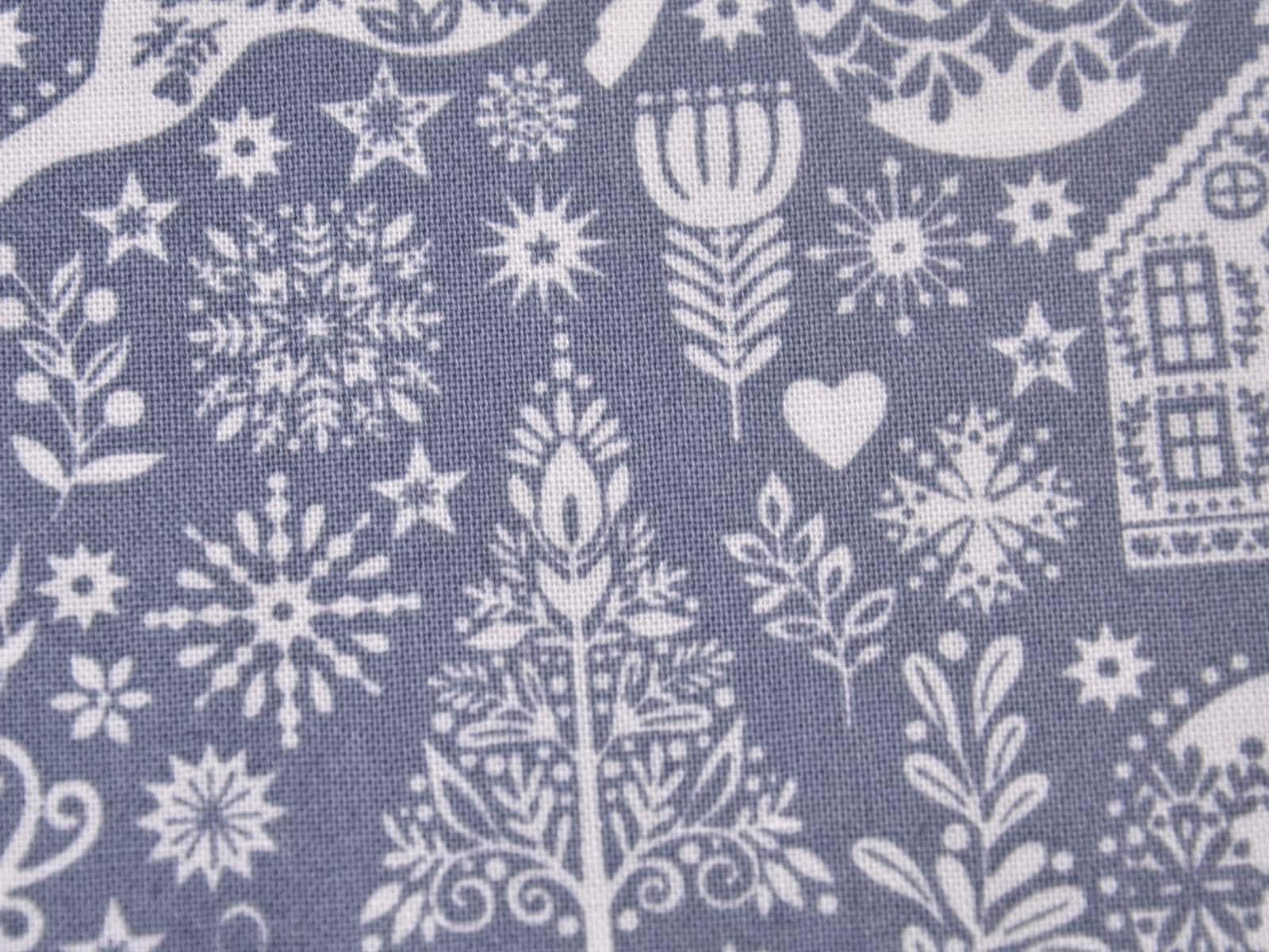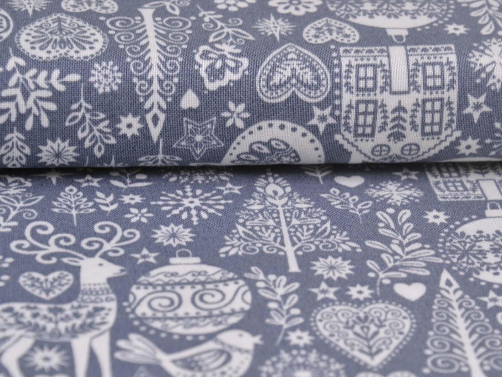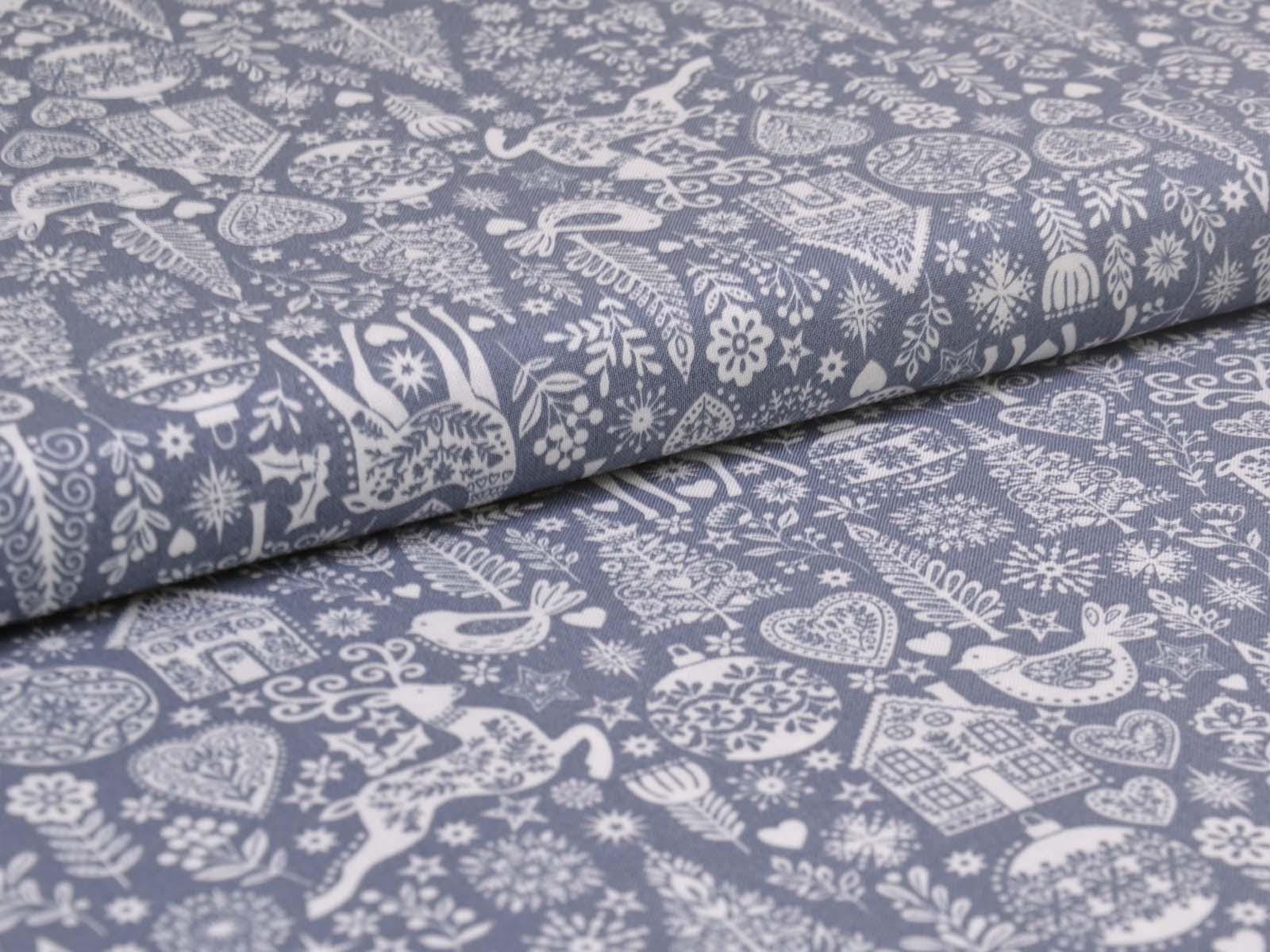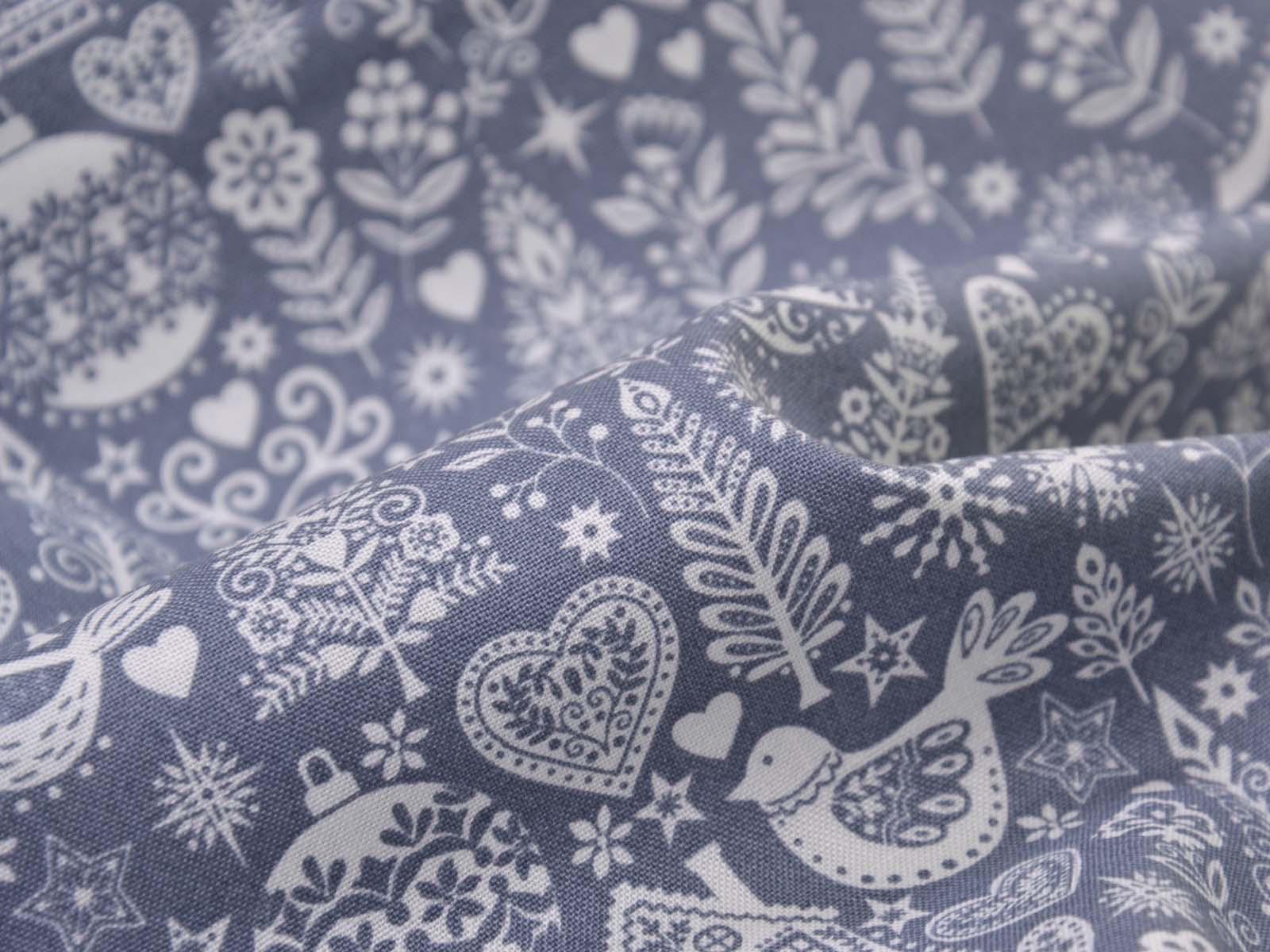 High-quality patchwork fabric made of cotton. The background is grey, with off-white deer, hearts, birds, houses, and baubles. You can use the fabric for patchwork projects, but also for sewing storage containers, placemats, tablecloths, and Christmas decorations.