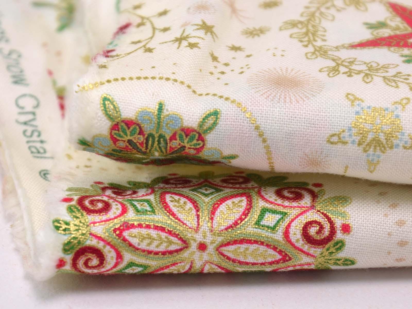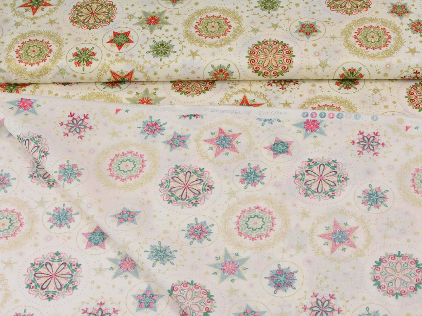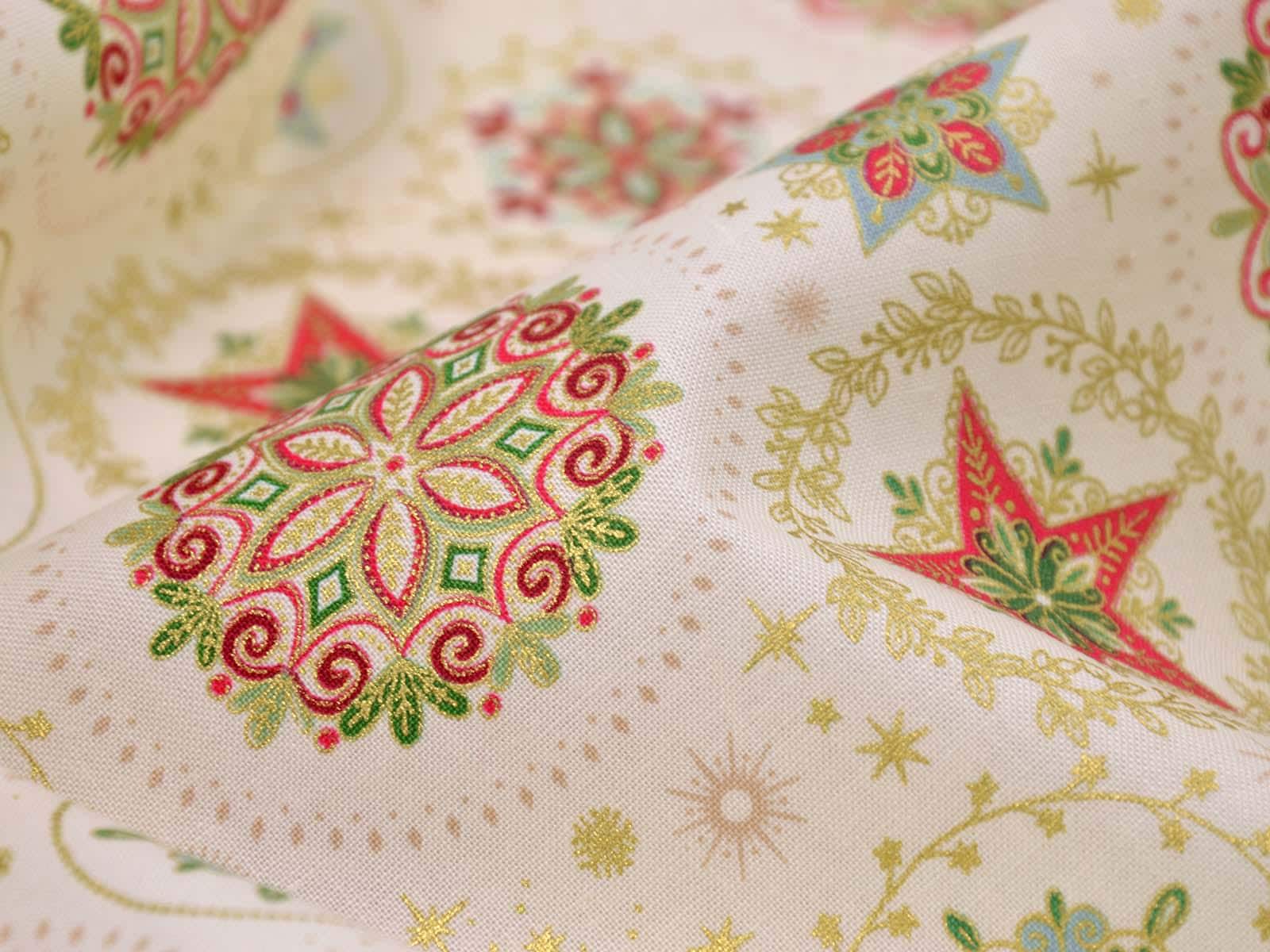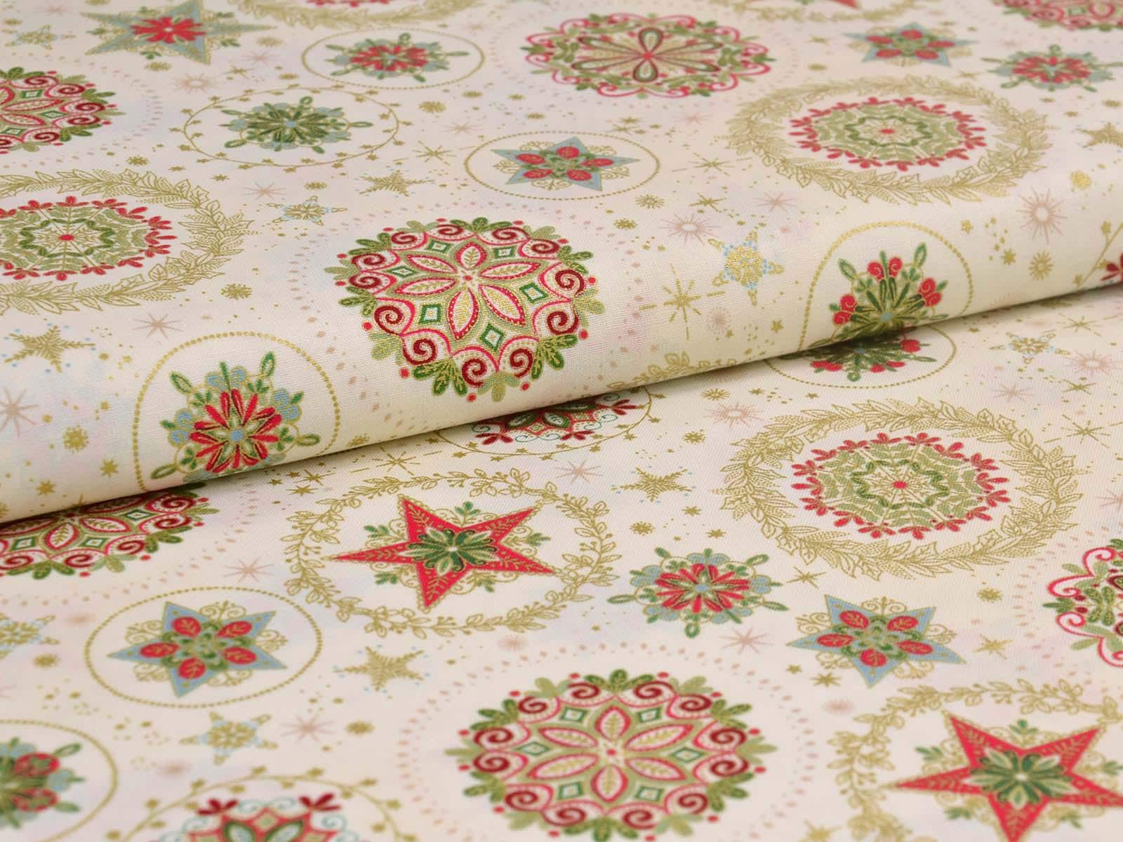High-quality patchwork fabric made of cotton. The background is cream, with wreaths and stars in gold, green, and red. You can use the fabric for patchwork projects, but also for sewing storage containers, placemats, tablecloths, and Christmas decorations.